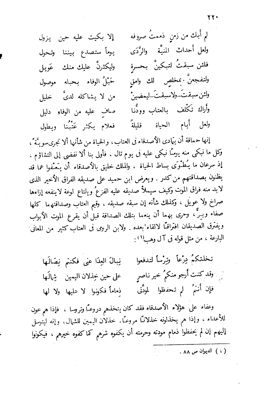 إذ سرعان ما يطوى بساط الحياة، ولذلك خليق بالأصدقاء أن يعفوا عما قد يظنون بصداقتهم من كدر. ويعرض ابن حميد على صديقه الفراق الأخير الذى لا بد منه فراق الموت وكيف سيملأ صديقه عليه الفزع ويلتاع لوعة لا ينفعه إزاءها صراخ ولا عويل، وكذلك شأنه إن سبقه صديقه، وقيم العتاب وصداقتهما كلها صفاء وبرّ، وحرى بهما أن ينعما بتلك الصداقة قبل أن يقرع الموت الأبواب ويفترق الصديقان افتراقا لالقاء بعده. ولابن الرومى فى العتاب كثير من المعانى البارعة، من مثل قوله فى آل وهب (¬1):