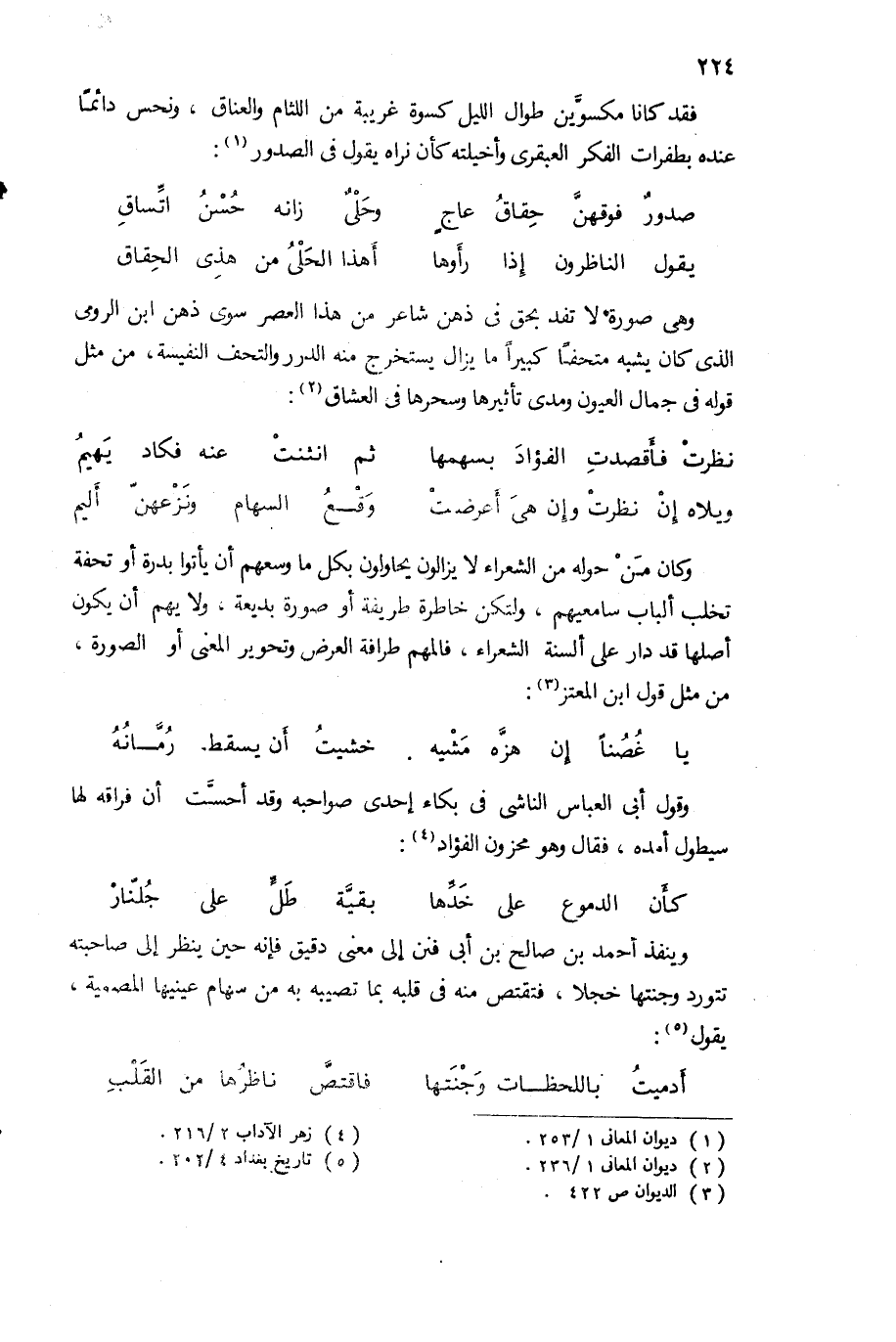 وكان من حوله من الشعراء لا يزالون يحاولون بكل ما وسعهم أن يأتوا بدرة أو تحفة تخلب الباب سامعيهم، ولتكن خاطرة طريفة أو صورة بديعة، ولا يهم أن يكون أصلها قد دار على ألسنة الشعراء، فالمهم طرافة العرض وتحوير المعنى أو الصورة، من مثل قول ابن المعتز (¬3):
