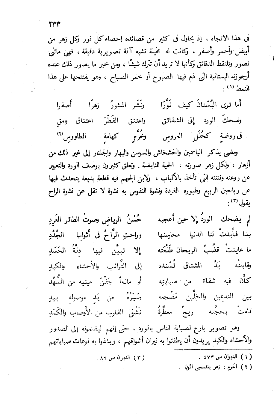 فى هذا الاتجاه، إذ يحاول فى كثير من قصائده إحصاء كل نور وكل زهر من أبيض وأحمر وأصفر، وكانت له مخيلة تشبه آلة تصويرية دقيقة، فهى ماتنى تصور وتلتقط الدقائق وكأنها لا تريد أن تترك شيئا، ومن خير ما يصور ذلك عنده أرجوزته البستانية التى ذم فيها الصبوح أو خمر الصباح، وهو يفتتحها على هذا النمط (¬1):