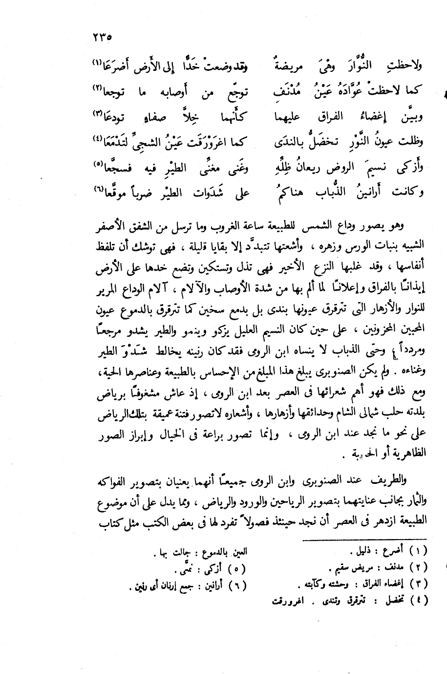 وهو يصور وداع الشمس للطبيعة ساعة الغروب وما ترسل من الشفق الأصفر الشبيه بنبات الورس وزهره، وأشعتها تتبدّد إلا بقايا قليلة، فهى توشك أن تلفظ أنفاسها، وقد غلبها النزع الأخير فهى تذل وتستكين وتضع خدها على الأرض إيذانا بالفراق وإعلانا لما ألم بها من شدة الأوصاب والآلام، آلام الوداع المرير للنوار والأزهار التى تترقرق عيونها بندى بل بدمع سخين كما تترقرق بالدموع عيون المحبين المحزونين. على حين كان النسيم العليل يزكو وينمو والطير يشدو مرجعا ومرددا، وحتى الذباب لا ينساه ابن الرومى فقد كان رنينه يخالط شدو الطير وغناءه. ولم يكن الصنوبرى يبلغ هذا المبلغ من الإحساس بالطبيعة وعناصرها الحية، ومع ذلك فهو أهم شعرائها فى العصر بعد ابن الرومى، إذ عاش مشغوفا برياض بلدته حلب شمالى الشام وحدائقها وأزهارها، وأشعاره لا تصور فتنة عميقة بتلك الرياض على نحو ما نجد عند ابن الرومى، وإنما تصور براعة فى الخيال وإبراز الصور الظاهرية أو؟ ؟ ؟ .