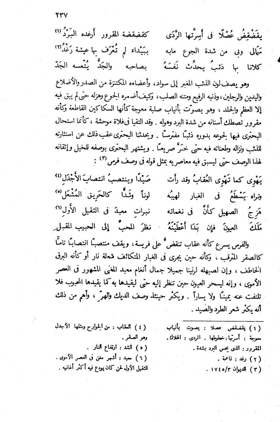 والفرس يسرع كأنه عقاب تنقض على فريسة، ويقف منتصبا انتصابا تامّا كالصقر المترقب، وكأنه حين يجرى فى الغبار المتكاثف شعلة نار أو كأنه البرق الخاطف، وإن لصيهله لرنينا جميلا جمال أنغام معبد المغنى المشهور فى العصر الأموى، وإنه ليسحر العيون حين تنظر إليه حتى ليقيدها به كما يقيدها المحبوب فلا تلتفت عنه يمينا ولا يسارا. ويكثر حينئذ وصف الديك والهرّ، وأهم من ذلك أنه يكثر شعر الطرد والصيد.