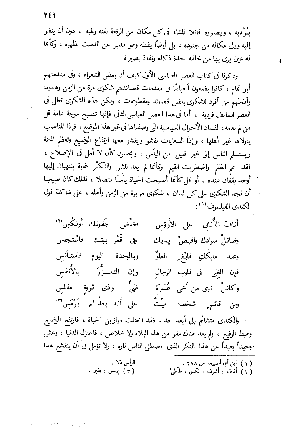 وذكرنا فى كتاب العصر العباسى الأول كيف أن بعض الشعراء، وفى مقدمتهم أبو تمام، كانوا يضعون أحيانا فى مقدمات قصائدهم شكوى مرة من الزمن وهمومه وأن منهم من أفرد للشكوى بعض قصائد ومقطوعات، ولكن هذه الشكوى تظل فى العصر السالف فردية، أما فى هذا العصر العباسى الثانى فإنها تصبح موجة عامة قل من لم تعمه، لفساد الأحوال السياسية التى وصفناها فى غير هذا الموضع، فإذا المناصب يتولاها غير أهلها، وإذا السعايات تفشو ويفشو معها ارتفاع الوضيع وتعظم المحنة ويستسلم الناس إلى غير قليل من اليأس، ويحسون كأن لا أمل فى الإصلاح، فقد عم الظلم واضطربت القيم وكأنما لم يعد للشر والنّكر غاية ينتهيان إليها أوحد يقفان عنده، أو قل كأنما أصبحت الحياة يأسا متصلا، لذلك كان طبيعيا أن نجد الشكوى على كل لسان، شكوى مريرة من الزمن وأهله، على شاكلة قول الكندى الفيلسوف (¬1):