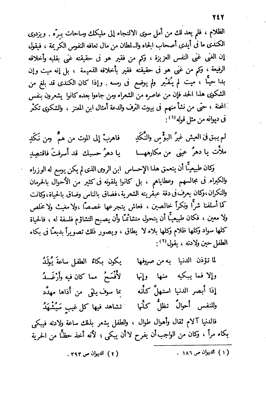 الظلام، فلم يعد لك من أمل سوى الالتجاء إلى مليكك وساحات برّه. ويزدرى الكندى ما فى أيدى أصحاب الجاه والسلطان من مال تعافه النفوس الكريمة، فيقول إن الغنى غنى النفس العزيزة، وكم من فقير هو فى حقيقته غنى بقلبه وأخلاقه الرفيعة، وكم من غنى هو فى حقيقته فقير بأخلاقه الذميمة، بل إنه ميت وإن بدا حيّا، ميت لم يقبر ولم يوضع فى رمسه. وإذا كان الكندى قد بلغ من الشكوى هذا الحد فإن من عاصره من الشعراء ومن جاءوا بعده كانوا يشعرون بنفس المحنة، حتى من نشأ منهم فى بيوت الترف والدعة أمثال ابن المعتز، والشكوى تكثر فى ديوانه من مثل قوله (¬1):