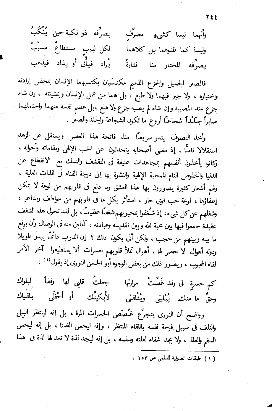 وواضح أن النورى يتجرّع غصصن الحسرات المرة، بل إنه لينتظر البلى والتلف فى سبيل فرحة نفسه باللقاء المنتظر، وإنه ليحس الضنا، بل إنه ليحس السقم والعلة، ولا يجد شفاء لعلته وسقمه، بل إنه ليجد لذة لا تعد لها لذة فى هذا