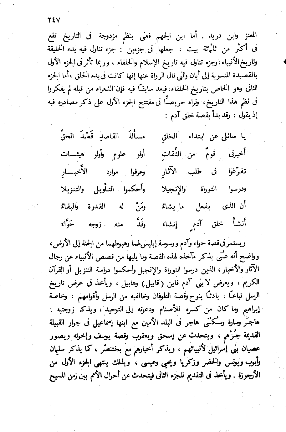 ويستمر فى قصة حواء وآدم ووسوسة إبليس لهما وهبوطهما من الجنة إلى الأرض، وواضح أنه عنى بذكر مآخذه لهذه القصة وما يليها من قصص الأنبياء عن رجال الآثار والأخبار، الذين درسوا التوراة والإنجيل وأحكموا دراسة التنزيل أو القرآن الكريم، ويعرض لا بنى آدم قاين (قابيل) وهابيل، ويأخذ فى عرض تاريخ الرسل تباعا، بادئا بنوح وقصة الطوفان وخالفيه من الرسل وأقوامهم، وخاصة إبراهيم وما كان من كسره للأصنام ودعوته إلى التوحيد، ويذكر زوجتيه: