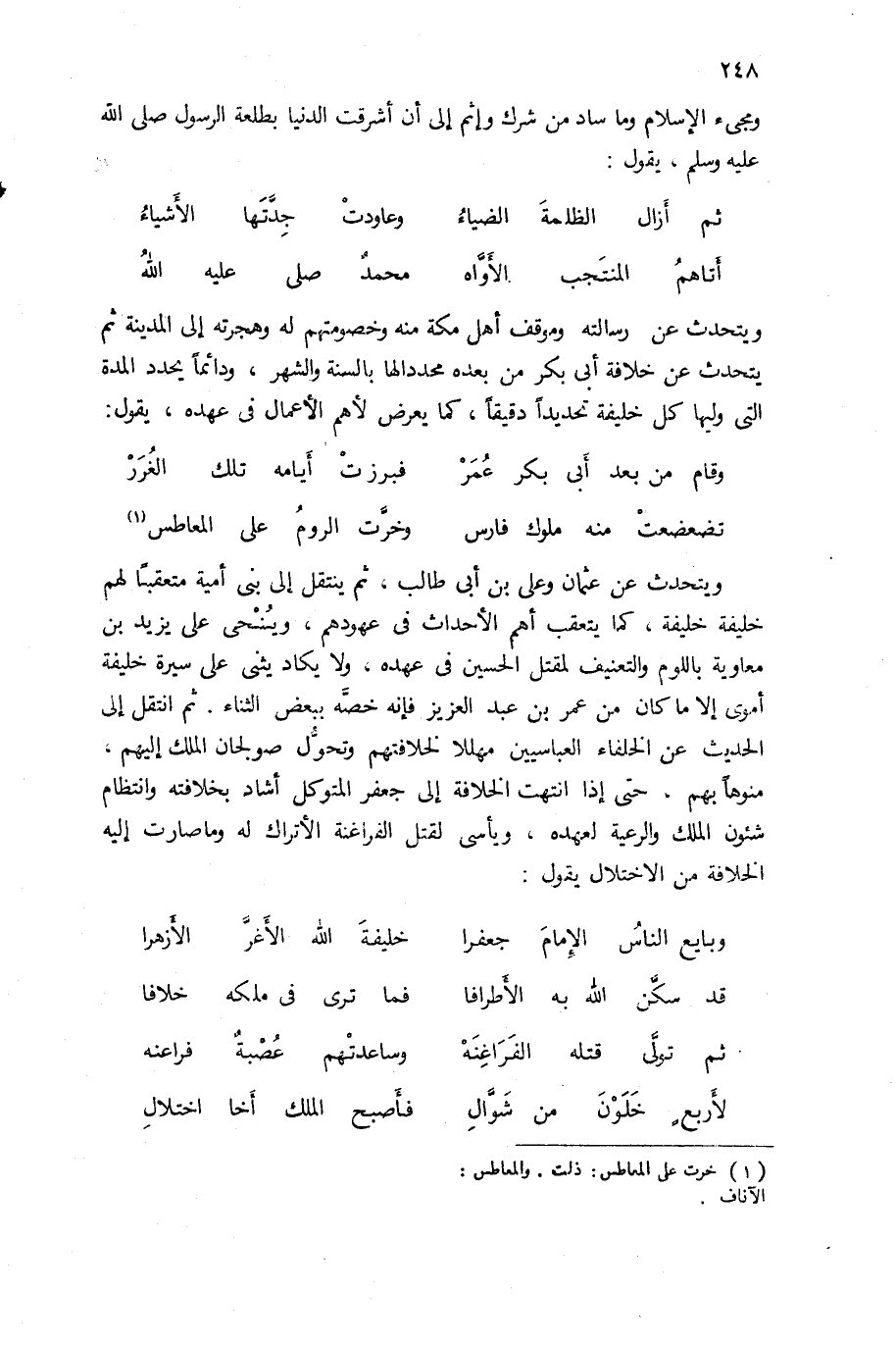 ويتحدث عن عثمان وعلى بن أبى طالب، ثم ينتقل إلى بنى أمية متعقبا لهم خليفة خليفة، كما يتعقب أهم الأحداث فى عهودهم، وينحى على يزيد بن معاوية باللوم والتعنيف لمقتل الحسين فى عهده، ولا يكاد يثنى على سيرة خليفة أموى إلا ما كان من عمر بن عبد العزيز فإنه خصّه ببعض الثناء. ثم انتقل إلى الحديث عن الخلفاء العباسيين مهللا لخلافتهم وتحوّل صولجان الملك إليهم، منوها بهم، حتى إذا انتهت الخلافة إلى جعفر المتوكل أشاد بخلافته وانتظام شئون الملك والرعية لعهده، ويأسى لقتل الفراغنة الأتراك له وما صارت إليه الخلافة من الاختلال يقول: