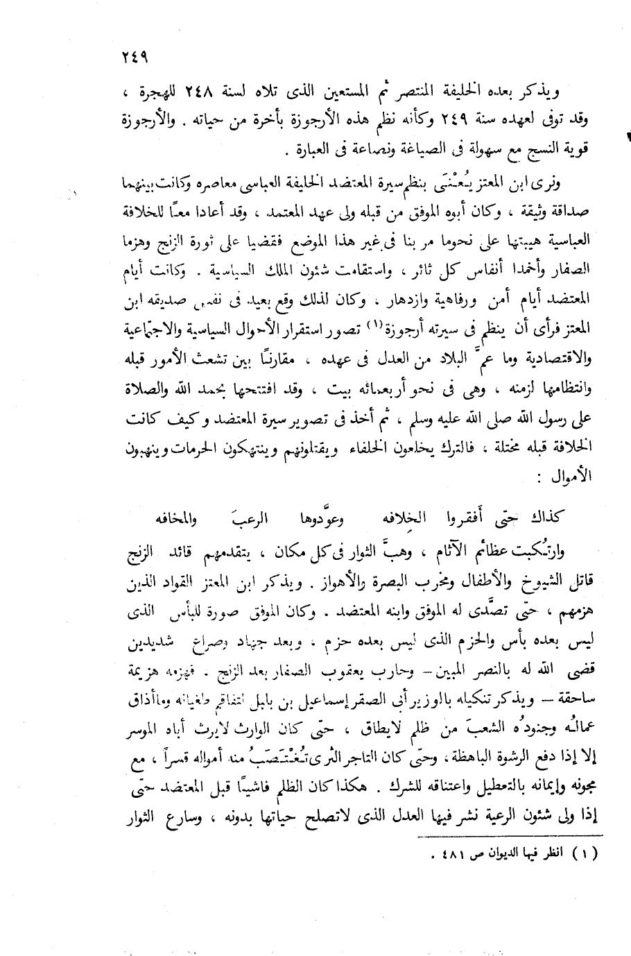 ونرى ابن المعتز يعنى بنظم سيرة المعتضد الخليفة العباسى معاصره وكانت بينهما صداقة وثيقة، وكان أبوه الموفق من قبله ولى عهد المعتمد، وقد أعادا معا للخلافة العباسية هيبتها على نحو ما مر بنا فى غير هذا الموضع فقضيا على ثورة الزنج وهزما الصفار وأخمدا أنفاس كل ثائر، واستقامت شئون الملك السياسية. وكانت أيام المعتضد أيام أمن ورفاهية وازدهار، وكان لذلك وقع بعيد فى نفس صديقه ابن المعتز فرأى أن ينظم فى سيرته أرجوزة (¬1) تصور استقرار الأحوال السياسية والاجتماعية والاقتصادية وما عمّ البلاد من العدل فى عهده، مقارنا بين تشعث الأمور قبله وانتظامها لزمنه، وهى فى نحو أربعمائة بيت، وقد افتتحها بحمد الله والصلاة على رسول الله صلى الله عليه وسلم، ثم أخذ فى تصوير سيرة المعتضد وكيف كانت الخلافة قبله مختلة، فالترك يخلعون الخلفاء ويقتلونهم وينتهكون الحرمات وينهبون الأموال:
