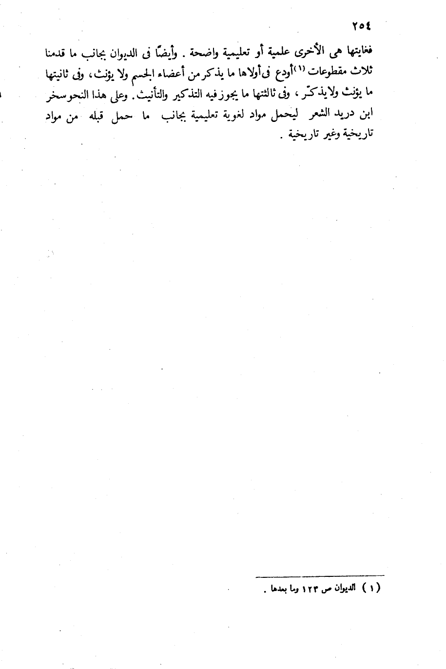فغايتها هى الأخرى علمية أو تعليمية واضحة. وأيضا فى الديوان بجانب ما قدمنا ثلاث مقطوعات (¬1) أودع فى أولاها ما يذكر من أعضاء الجسم ولا يؤنث، وفى ثانيتها ما يؤنث ولا يذكّر، وفى ثالثتها ما يجوز فيه التذكير والتأنيث. وعلى هذا النحو سخر ابن دريد الشعر ليحمل مواد لغوية تعليمية بجانب ما حمل قبله من مواد تاريخية وغير تاريخية.