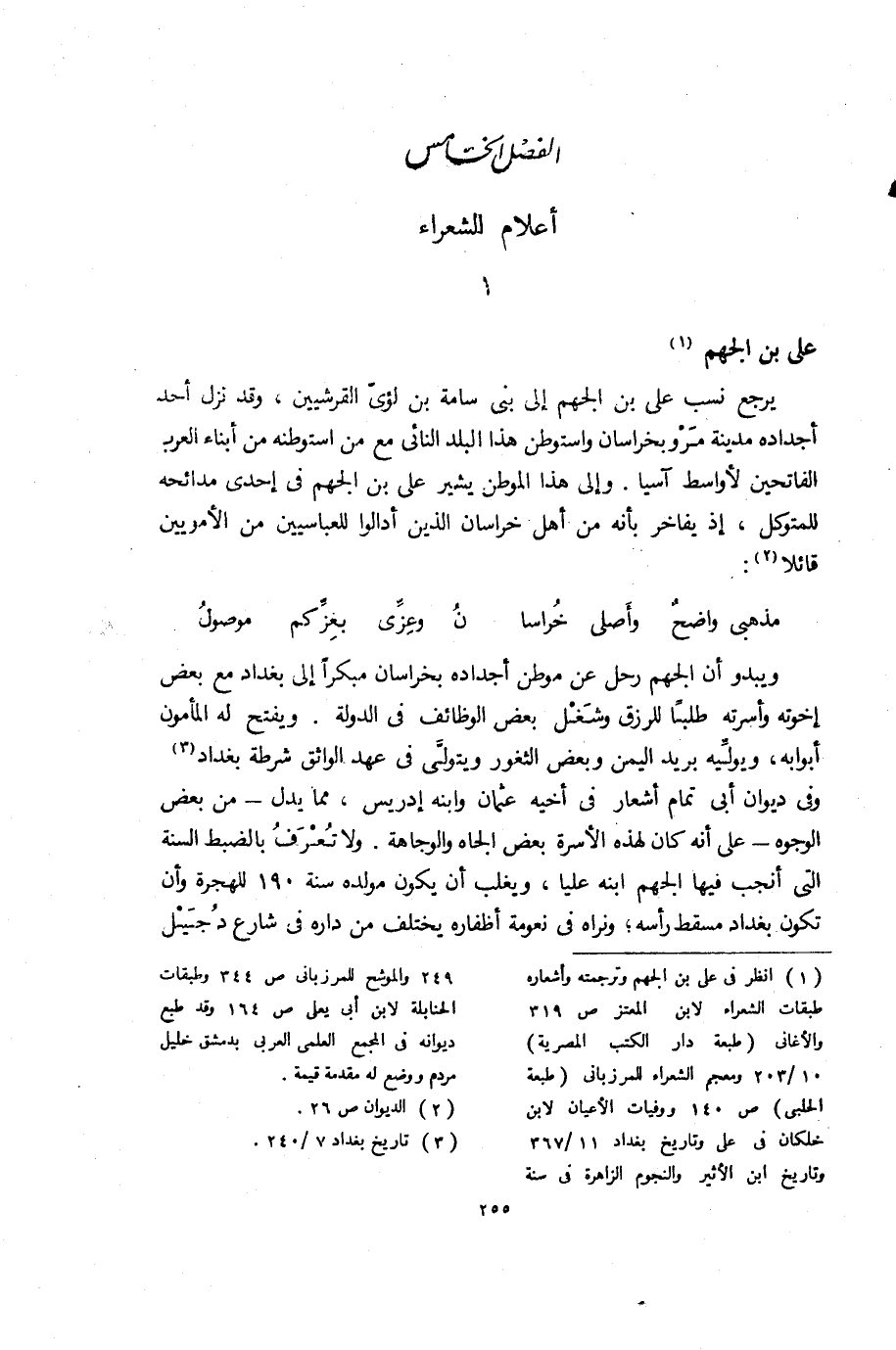 (¬1) انظر فى على بن الجهم وترجمته وأشعاره طبقات الشعراء لابن المعتز ص 319 والأغانى (طبعة دار الكتب المصرية) 10/ 203 ومعجم الشعراء للمرزبانى (طبعة الحلبى) ص 140 ووفيات الأعيان لابن خلكان فى على وتاريخ بغداد 11/ 367 وتاريخ ابن الأثير والنجوم الزاهرة فى سنة 249 والموشح للمرزبانى ص 344 وطبقات الحنابلة لابن أبى يعلى ص 164 وقد طبع ديوانه فى المجمع العلمى العربى بدمشق خليل مردم ووضع له مقدمة قيمة.