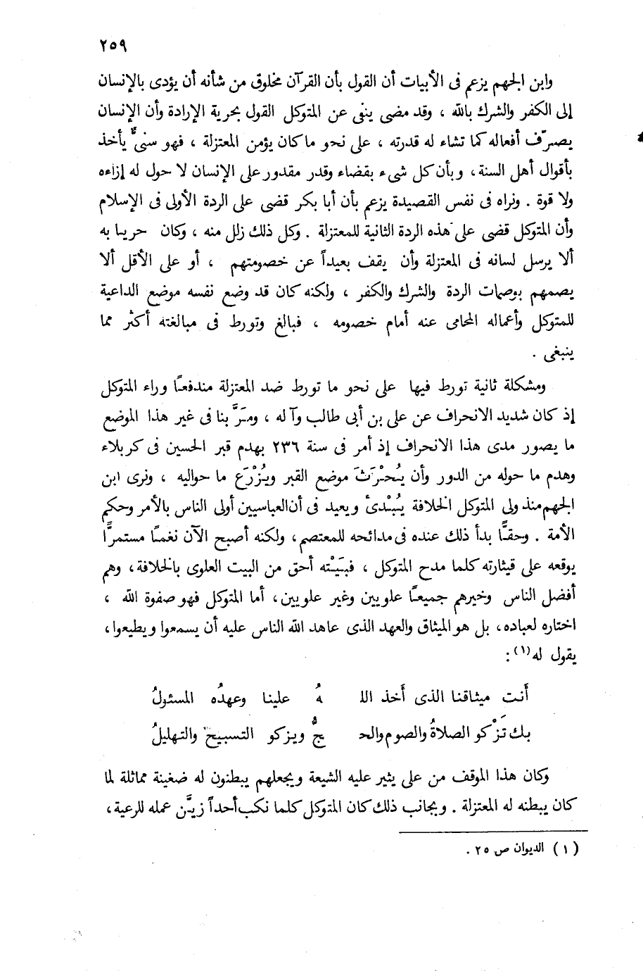 ومشكلة ثانية تورط فيها على نحو ما تورط ضد المعتزلة مندفعا وراء المتوكل إذ كان شديد الانحراف عن على بن أبى طالب وآله، ومرّ بنا فى غير هذا الموضع ما يصور مدى هذا الانحراف إذ أمر فى سنة 236 بهدم قبر الحسين فى كربلاء وهدم ما حوله من الدور وأن يحرث موضع القبر ويزرع ما حواليه، ونرى ابن الجهم منذ ولى المتوكل الخلافة يبدئ ويعيد فى أن العباسيين أولى الناس بالأمر وحكم الأمة. وحقّا بدأ ذلك عنده فى مدائحه للمعتصم، ولكنه أصبح الآن نغما مستمرّا يوقعه على قيثارته كلما مدح المتوكل، فبيته أحق من البيت العلوى بالخلافة، وهم أفضل الناس وخيرهم جميعا علويين وغير علويين، أما المتوكل فهو صفوة الله، اختاره لعباده، بل هو الميثاق والعهد الذى عاهد الله الناس عليه أن يسمعوا ويطيعوا، يقول له (¬1):