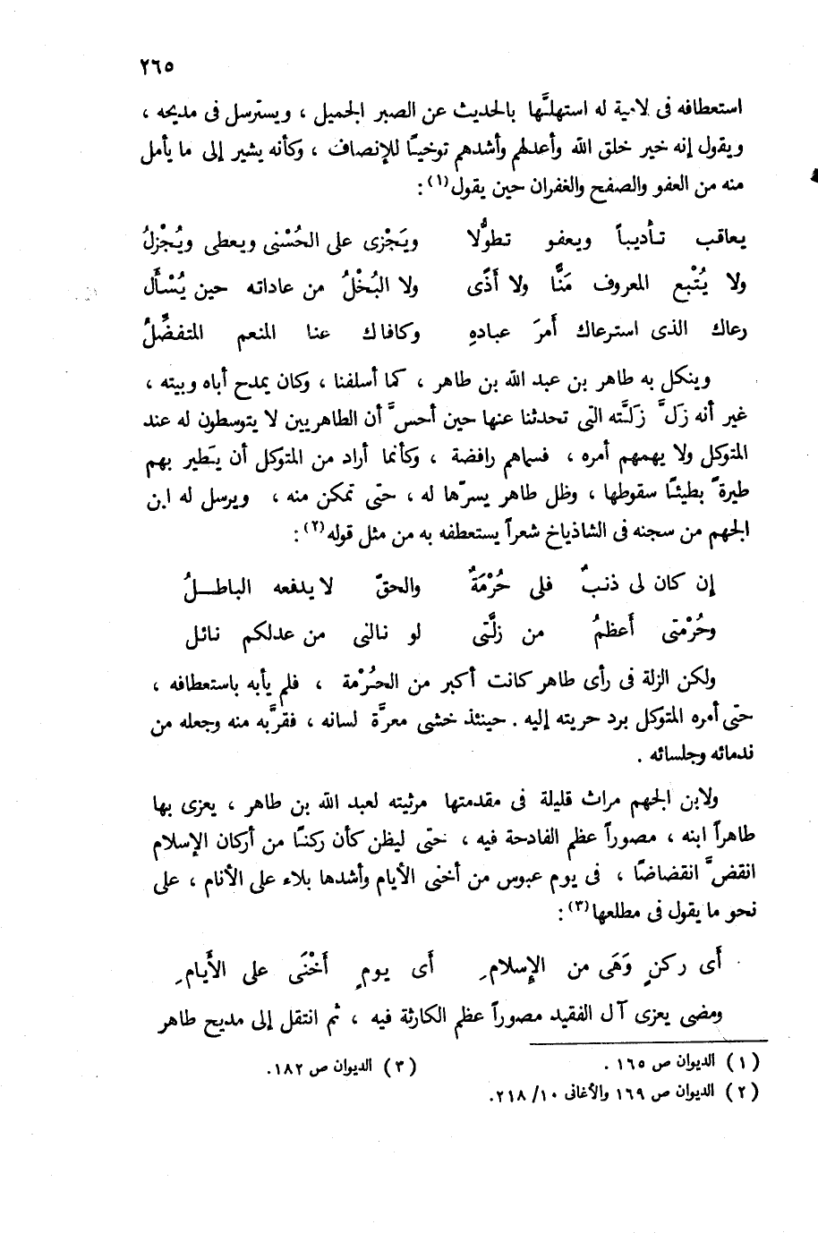وينكل به طاهر بن عبد الله بن طاهر، كما أسلفنا، وكان يمدح أباه وبيته، غير أنه زلّ زلّته التى تحدثنا عنها حين أحسّ أن الطاهريين لا يتوسطون له عند المتوكل ولا يهمهم أمره، فسماهم رافضة، وكأنما أراد من المتوكل أن يطير بهم طيرة بطيئا سقوطها، وظل طاهر يسرّها له، حتى تمكن منه، ويرسل له ابن الجهم من سجنه فى الشاذياخ شعرا يستعطفه به من مثل قوله (¬2):