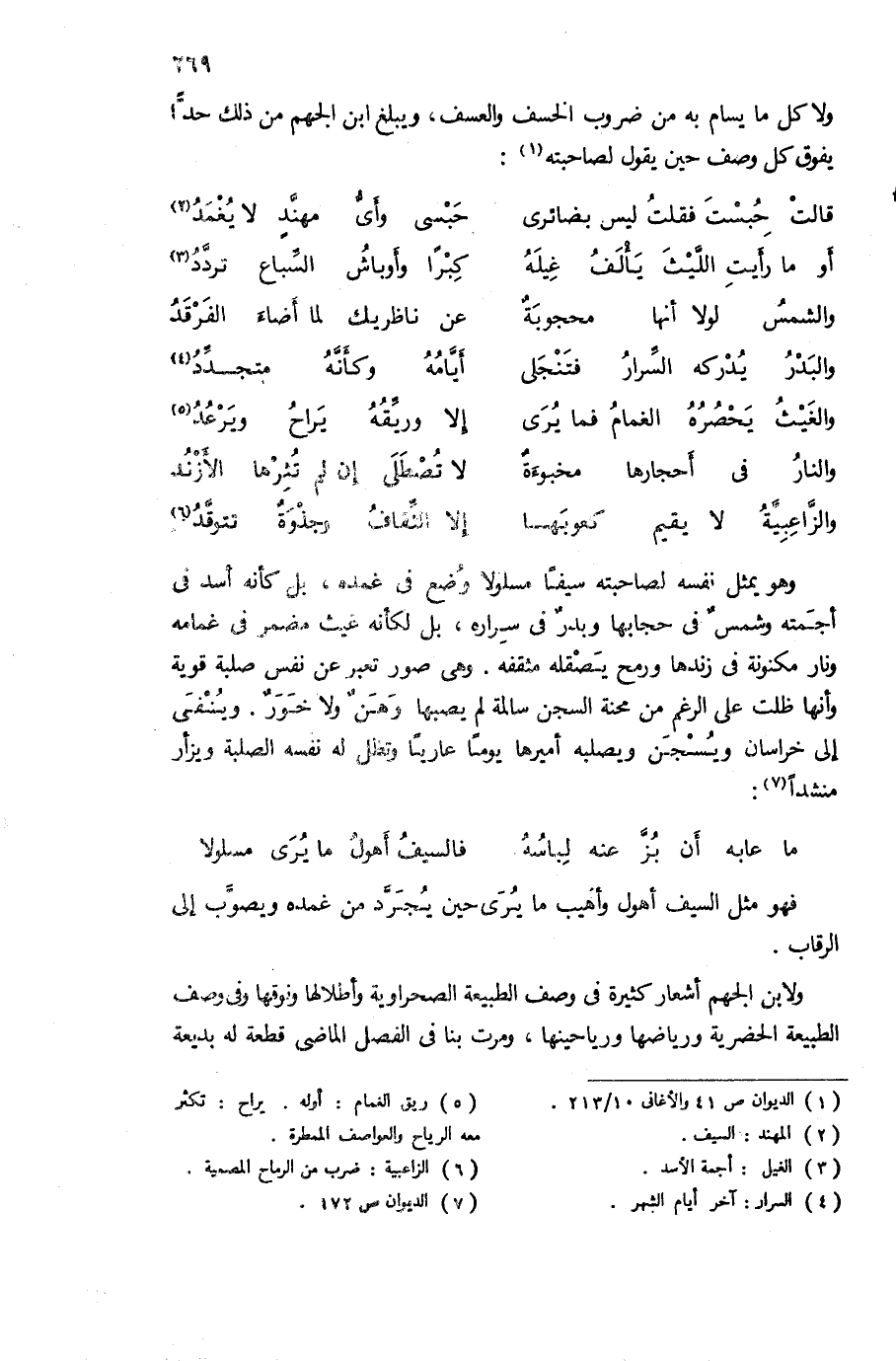 وهو يمثل نفسه لصاحبته سيفا مسلولا وضع فى غمده، بل كأنه أسد فى أجمته وشمس فى حجابها وبدر فى سراره، بل لكأنه غيث مضمر فى غمامه ونار مكنونة فى زندها ورمح يصقله مثقفه. وهى صور تعبر عن نفس صلبة قوية وأنها ظلت على الرغم من محنة السجن سالمة لم يصبها وهن ولا خور. وينفى إلى خراسان ويسجن ويصلبه أميرها يوما عاريا وتظل له نفسه الصلبة ويزأر منشدا (¬7):