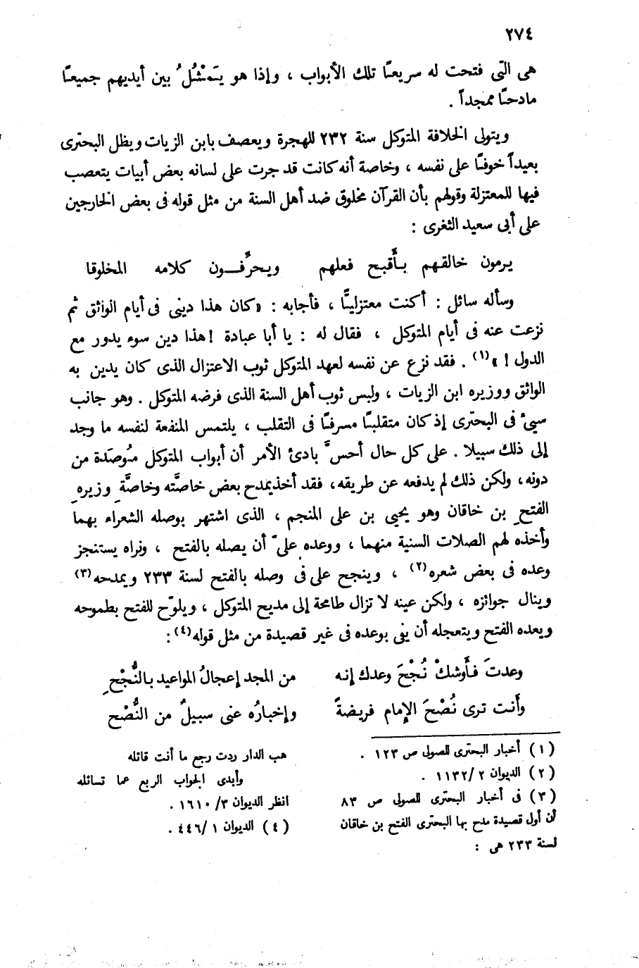 وسأله سائل: أكنت معتزليّا، فأجابه: «كان هذا دينى فى أيام الواثق ثم نزعت عنه فى أيام المتوكل، فقال له: يا أبا عبادة! هذا دين سوء يدور مع الدول! » (¬1). فقد نزع عن نفسه لعهد المتوكل ثوب الاعتزال الذى كان يدين به الواثق ووزيره ابن الزيات، ولبس ثوب أهل السنة الذى فرضه المتوكل. وهو جانب سيئ فى البحترى إذ كان متقلبا مسرفا فى التقلب، يلتمس المنفعة لنفسه ما وجد إلى ذلك سبيلا. على كل حال أحسّ بادئ الأمر أن أبواب المتوكل موصدة من دونه، ولكن ذلك لم يدفعه عن طريقه، فقد أخذ يمدح بعض خاصّته وخاصّة وزيره الفتح بن خاقان وهو يحيى بن على المنجم، الذى اشتهر بوصله الشعراء بهما وأخذه لهم الصلات السنية منهما، ووعده علىّ أن يصله بالفتح، ونراه يستنجز وعده فى بعض شعره (¬2)، وينجح على فى وصله بالفتح لسنة 233 ويمدحه (¬3) وينال جوائزه، ولكن عينه لا تزال طامحة إلى مديح المتوكل، ويلوّح للفتح بطموحه ويعده الفتح ويتعجله أن يفى بوعده فى غير قصيدة من مثل قوله (¬4):