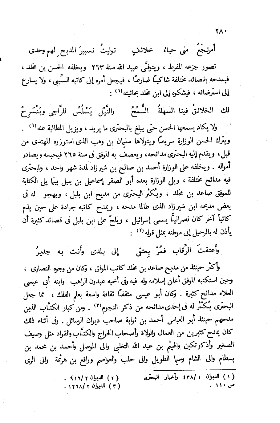 وأكثر حينئذ من مديح صاعد بن مخلد كاتب الموفق، وكان من وجوه النصارى، وحين استكتبه الموفق أعلن إسلامه وله فيه وفى أخيه عبدون الراهب وابنه أبى عيسى العلاء مدائح كثيرة. وكان أبو عيسى مثقفا ثقافة واسعة بعلم الفلك، مما جعل البحترى يكثر له فى إحدى مدائحه من ذكر النجوم (¬3). ومن كبار الكتّاب الذين مدحهم حينئذ أبو العباس أحمد بن ثوابة صاحب ديوان الرسائل. وفى أثناء ذلك كان يمدح كثيرين من العمال والولاة وأصحاب الخراج والكتّاب والقواد مثل وصيف الصغير وأذكوتكين والهيثم بن عبد الله التغلبى والى الموصل وأحمد بن محمد بن بسطام والى الشام وسيما الطويل والى حلب والعواصم ورافع بن هرثمة والى الرى