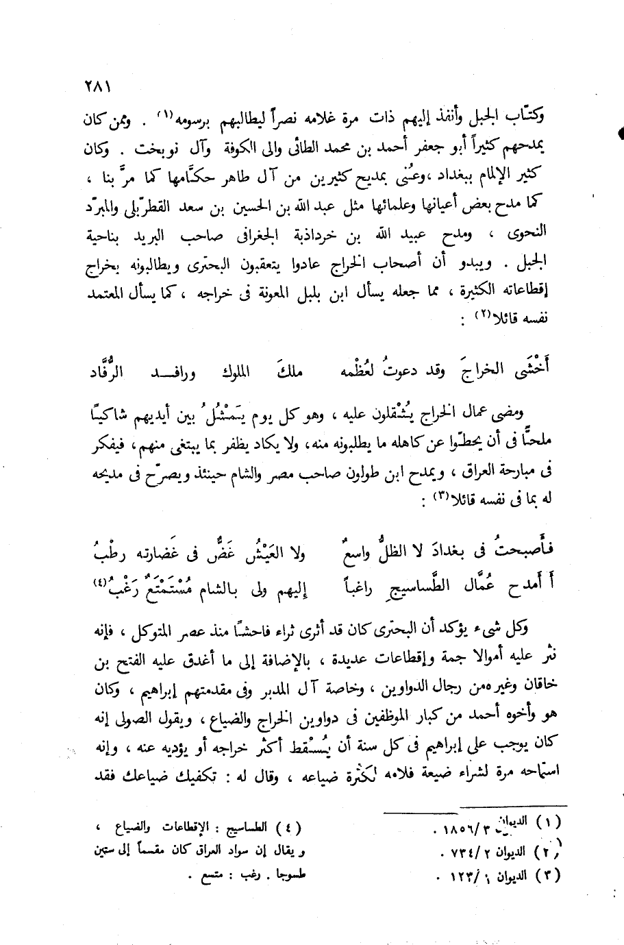 وكتّاب الجبل وأنفذ إليهم ذات مرة غلامه نصرا ليطالبهم برسومه (¬1). وممن كان يمدحهم كثيرا أبو جعفر أحمد بن محمد الطائى والى الكوفة وآل نوبخت. وكان كثير الإلمام ببغداد، وعنى بمديح كثيرين من آل طاهر حكّامها كما مرّ بنا، كما مدح بعض أعيانها وعلمائها مثل عبد الله بن الحسين بن سعد القطرّبلى والمبرّد النحوى، ومدح عبيد الله بن خرداذبة الجغرافى صاحب البريد بناحية الجبل. ويبدو أن أصحاب الخراج عادوا يتعقبون البحترى ويطالبونه بخراج إقطاعاته الكثيرة، مما جعله يسأل ابن بلبل المعونة فى خراجه، كما يسأل المعتمد نفسه قائلا (¬2):