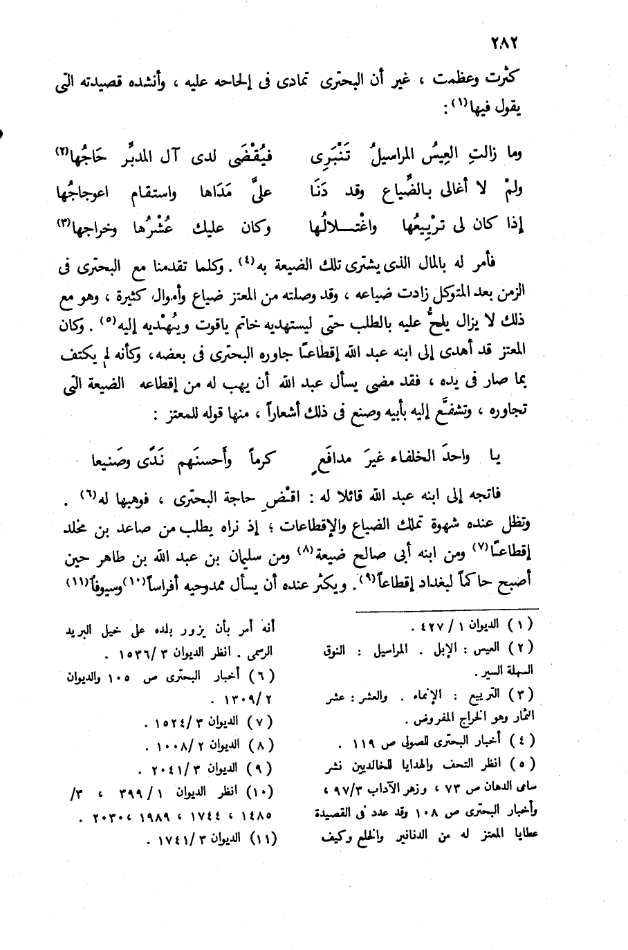 (¬5) انظر التجف والهدايا للخالديين نشر سامى الدهان ص 73، وزهر الآداب 3/ 97، وأخبار البحترى ص 108 وقد عدد فى القصيدة عطايا المعتز له من الدنانير والخلع وكيف أنه أمر بأن يزور بلده على خيل البريد الرسمى. انظر الديوان 3/ 1536.