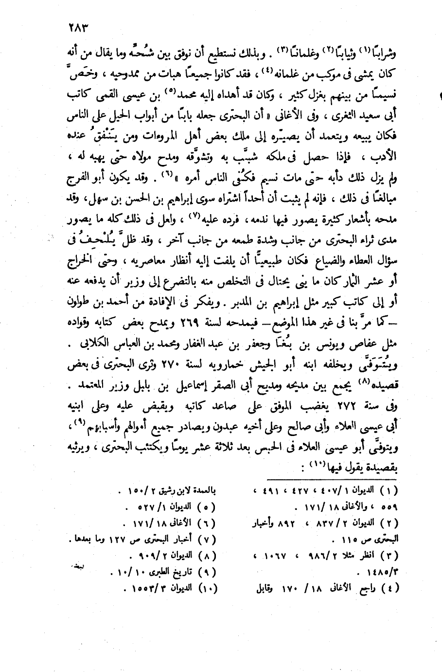 وشرابا (¬1) وثيابا (¬2) وغلمانا (¬3). وبذلك نستطيع أن نوفق بين شحّه وما يقال من أنه كان يمشى فى موكب من غلمانه (¬4)، فقد كانوا جميعا هبات من ممدوحيه، وخصّ نسيما من بينهم بغزل كثير، وكان قد أهداه إليه محمد (¬5) بن عيسى القمى كاتب أبى سعيد الثغرى، وفى الأغانى «أن البحترى جعله بابا من أبواب الحيل على الناس فكان يبيعه ويتعمد أن يصيّره إلى ملك بعض أهل المروءات ومن ينفق عنده الأدب، فإذا حصل فى ملكه شبّب به وتشوّقه ومدح مولاه حتى يهبه له، ولم يزل ذلك دأبه حتى مات نسيم فكفى الناس أمره» (¬6). وقد يكون أبو الفرج مبالغا فى ذلك، فإنه لم يثبت أن أحدا اشتراه سوى إبراهيم بن الحسن بن سهل، وقد مدحه بأشعار كثيرة يصور فيها ندمه، فرده عليه (¬7)، ولعل فى ذلك كله ما يصور مدى ثراء البحترى من جانب وشدة طمعه من جانب آخر، وقد ظلّ يلحف فى سؤال العطاء والضياع فكان طبيعيّا أن يلفت إليه أنظار معاصريه، وحتى الخراج أو عشر الثمار كان ما ينى يحتال فى التخلص منه بالتضرع إلى وزير أن يدفعه عنه أو إلى كاتب كبير مثل إبراهيم بن المدبر. ويفكر فى الإفادة من أحمد بن طولون -كما مرّ بنا فى غير هذا الموضع-فيمدحه لسنة 269 ويمدح بعض كتابه وقواده مثل عفاص ويونس بن بغا وجعفر بن عبد الغفار ومحمد بن العباس الكلابى.