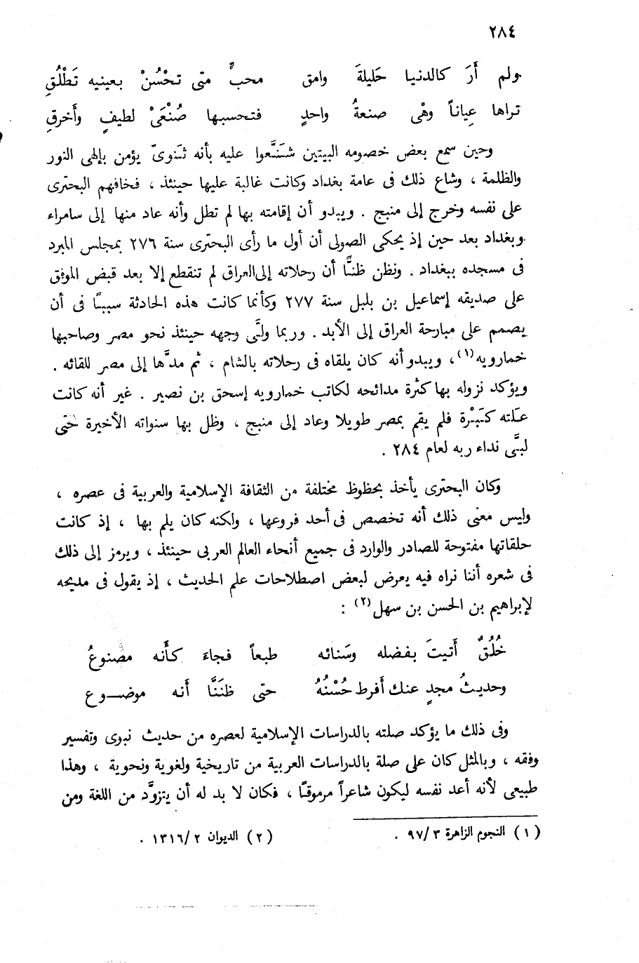 وحين سمع بعض خصومه البيتين شنّعوا عليه بأنه ثنوى يؤمن بإلهى النور والظلمة، وشاع ذلك فى عامة بغداد وكانت غالبة عليها حينئذ، فخافهم البحترى على نفسه وخرج إلى منبج. ويبدو أن إقامته بها لم تطل وأنه عاد منها إلى سامراء وبغداد بعد حين إذ يحكى الصولى أن أول ما رأى البحترى سنة 276 بمجلس المبرد فى مسجده ببغداد. ونظن ظنّا أن رحلاته إلى العراق لم تنقطع إلا بعد قبض الموفق على صديقه إسماعيل بن بلبل سنة 277 وكأنما كانت هذه الحادثة سببا فى أن يصمم على مبارحة العراق إلى الأبد. وربما ولّى وجهه حينئذ نحو مصر وصاحبها خمارويه (¬1). ويبدو أنه كان يلقاه فى رحلاته بالشام، ثم مدّها إلى مصر للقائه.