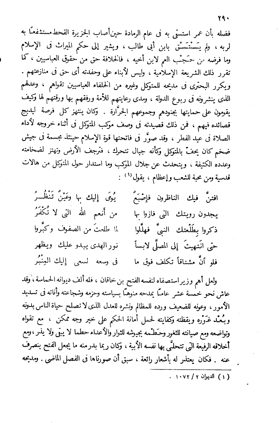 ولعل أهم وزير استصفاه لنفسه الفتح بن خاقان، فله ألف ديوانه الحماسة، وقد عاش نحو خمسة عشر عاما يمدحه منوها بسياسته وحزمه وشجاعته وأناته فى تسديد الأمور، وعونه للضعيف ورده للمظالم ونشره للعدل الذى لا تصلح حياة الناس بدونه وبعد غوره ويقظته وكفايته لحمل أمانة الحكم على خير وجه ممكن، مع تقواه وتواضعه ومع صيانته للثغور وحطمه بجيوشه للثوار والأعداء حطما لا يبقى ولا يذر، ومع أخلاقه الرفيعة التى تتحلّى بها نفسه الأبية، وكان ربما بدر منه ما يجعل الفتح ينصرف عنه. فكان يعتذر له بأشعار رائعة، سبق أن صورناها فى الفصل الماضى. ومديحه