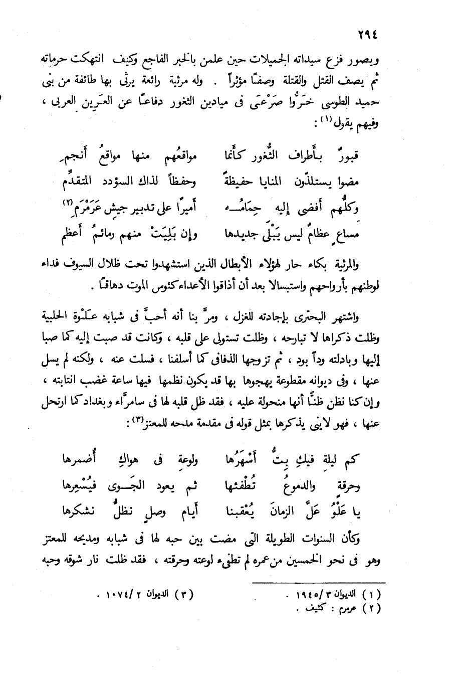 ويصور فزع سيداته الجميلات حين علمن بالخبر الفاجع وكيف انتهكت حرماته ثم يصف القتل والقتلة وصفا مؤثرا. وله مرثية رائعة يرثى بها طائفة من بنى حميد الطوسى خرّوا صرعى فى ميادين الثغور دفاعا عن العرين العربى، وفيهم يقول (¬1):