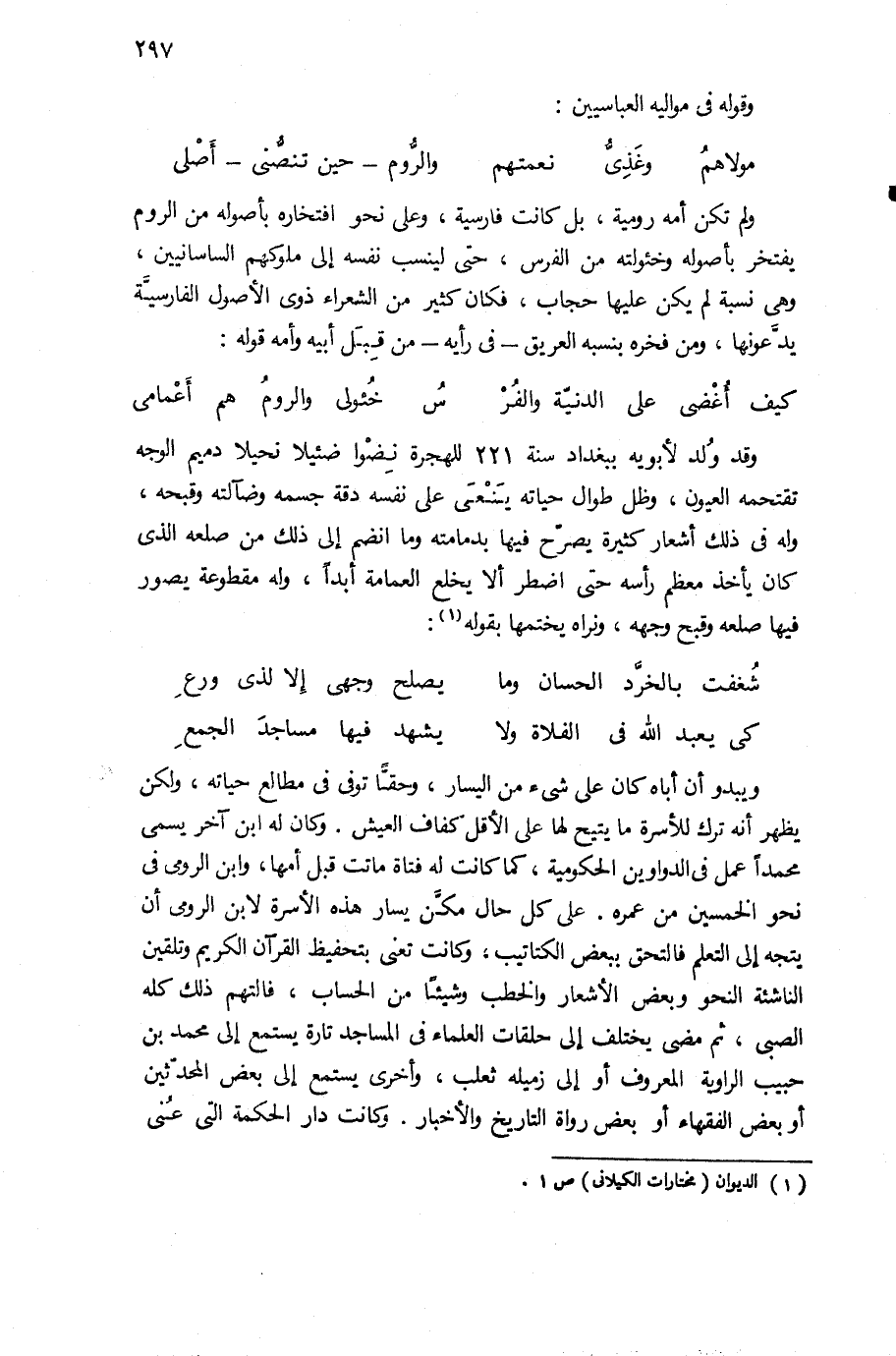 وقد ولد لأبويه ببغداد سنة 221 للهجرة نضوا ضئيلا نحيلا دميم الوجه تقتحمه العيون، وظل طوال حياته ينعى على نفسه دقة جسمه وضآلته وقبحه، وله فى ذلك أشعار كثيرة يصرح فيها بدمامته وما انضم إلى ذلك من صلعه الذى كان يأخذ معظم رأسه حتى اضطر ألا يخلع العمامة أبدا، وله مقطوعة يصور فيها صلعه وقبح وجهه، ونراه يختمها بقوله (¬1):