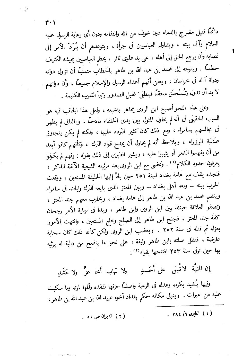 وعلى هذا النحو أصبح ابن الرومى يجاهر بتشيعه، ولعل هذا الجانب فيه هو السبب الحقيقى فى أنه لم يحاول المثول بين يدى الخلفاء مادحا، وبالتالى لم يظهر فى مجالسهم بسامراء، ومع ذلك كان كثير التردد عليها، ولكنه لم يكن يتجاوز عتبة الوزراء، ويلاحظ أنه لم يحاول أن يمدح قواد الترك، وكأنهم كانوا أبعد من أن يفهموا الشعر أو يثيبوا عليه، ويشير الطبرى إلى ذلك بقوله: إنهم لم يكونوا يعرفون حدود الكلام (¬1). ونمضى مع ابن الرومى بعد مرثيته الشيعية الآنفة الذكر، فنجده يقف مع عامة بغداد لسنة 251 حين لجأ إليها الخليفة المستعين، ووقعت الحرب بينه-ومعه أهل بغداد-وبين المعتز الذى بايعه الترك والجند فى سامراء وينضم محمد بن عبد الله بن طاهر إلى عامة بغداد، ويحارب معهم جند المعتز، وتصفو العلاقة حينئذ بين ابن الرومى وابن طاهر، وبدا فى نهاية الأمر رجحان كفة جند المعتز، فجنح ابن طاهر إلى الصلح وخلع المستعين، وانتهت الأمور بعزله ثم قتله فى سنة 252. ويغضب ابن الرومى ولكن كأنما ذلك كان سحابة عارضة، فتظل صلته بابن طاهر وثيقة، على نحو ما يتضح من دالية له يرثيه بها حين توفى سنة 253 افتتحها بقوله (¬2):