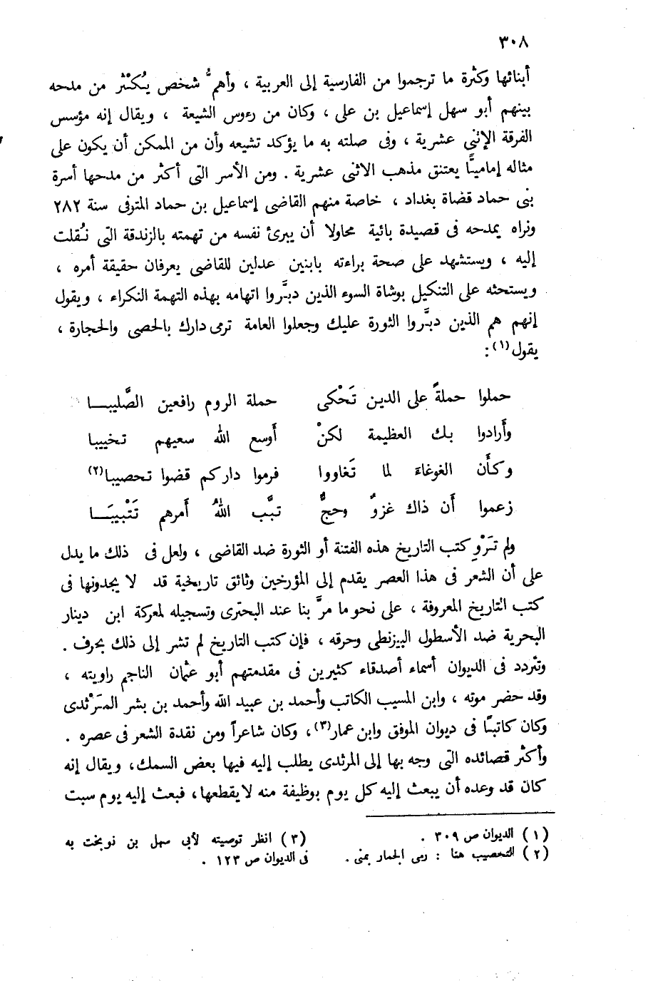 أبنائها وكثرة ما ترجموا من الفارسية إلى العربية، وأهمّ شخص يكثر من مدحه بينهم أبو سهل إسماعيل بن على، وكان من رءوس الشيعة، ويقال إنه مؤسس الفرقة الإثنى عشرية، وفى صلته به ما يؤكد تشيعه وأن من الممكن أن يكون على مثاله إماميّا يعتنق مذهب الاثنى عشرية. ومن الأسر التى أكثر من مدحها أسرة بنى حماد قضاة بغداد، خاصة منهم القاضى إسماعيل بن حماد المتوفى سنة 282 ونراه يمدحه فى قصيدة بائية محاولا أن يبرئ نفسه من تهمته بالزندقة التى نقلت إليه، ويستشهد على صحة براءته بابنين عدلين للقاضى يعرفان حقيقة أمره، ويستحثه على التنكيل بوشاة السوء الذين دبّروا اتهامه بهذه التهمة النكراء، ويقول إنهم هم الذين دبّروا الثورة عليك وجعلوا العامة ترمى دارك بالحصى والحجارة، يقول (¬1):