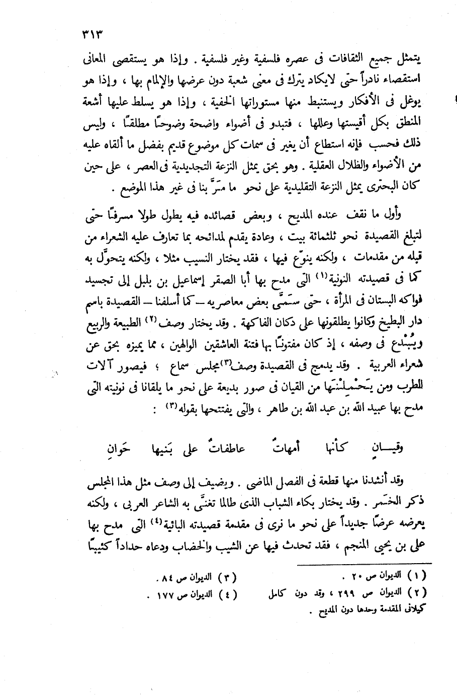 يتمثل جميع الثقافات فى عصره فلسفية وغير فلسفية. وإذا هو يستقصى المعانى استقصاء نادرا حتى لا يكاد يترك فى معنى شعبة دون عرضها والإلمام بها، وإذا هو يوغل فى الأفكار ويستنبط منها مستوراتها الخفية، وإذا هو يسلط عليها أشعة المنطق بكل أقيستها وعللها، فتبدو فى أضواء واضحة وضوحا مطلقا، وليس ذلك فحسب فإنه استطاع أن يغير فى سمات كل موضوع قديم بفضل ما ألقاه عليه من الأضواء والظلال العقلية. وهو بحق يمثل النزعة التجديدية فى العصر، على حين كان البحترى يمثل النزعة التقليدية على نحو ما مرّ بنا فى غير هذا الموضع.