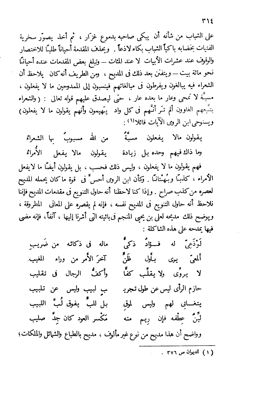 على الشباب من شأنه أن يبكى صاحبه بدموع غزار، ثم أخذ يصوّر سخرية الفتيات بخضابه باكيا الشباب بكاء لاذعا. ويحذف المقدمة أحيانا طلبا للاختصار والوقوف عند عشرات الأبيات لا عند المئات-وتبلغ بعض المقدمات عنده أحيانا نحو مائة بيت-ويتفنن بعد ذلك فى المديح، ومن الطريف أنه كان يلاحظ أن الشعراء فيه يبالغون ويفرطون فى مبالغاتهم فينسبون إلى الممدوحين ما لا يفعلون، مسّة لا تمحى وعار ما بعده عار، حتى ليصدق عليهم قوله تعالى: {(وَالشُّعَراءُ يَتَّبِعُهُمُ الْغاوُونَ أَلَمْ تَرَ أَنَّهُمْ فِي كُلِّ وادٍ يَهِيمُونَ وَأَنَّهُمْ يَقُولُونَ ما لا يَفْعَلُونَ)} ويستوحى ابن الرومى الآيات قائلا (¬1):