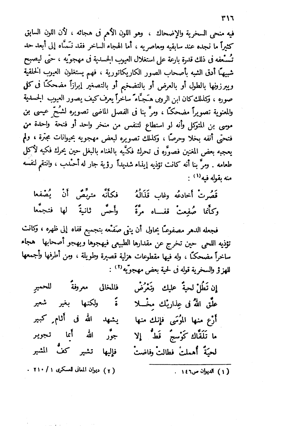 فيه منحى السخرية والإضحاك، وهو اللون الأهم فى هجائه، لأن اللون السابق كثيرا ما نجده عند سابقيه ومعاصريه، أما الهجاء الساخر فقد نمّاه إلى أبعد حد تسعفه فى ذلك قدرة بارعة على استغلال العيوب الجسدية فى مهجويّه، حتى ليصبح شبيها أدق الشبه بأصحاب الصور الكاريكاتورية، فهم يستغلون العيوب الخلقية ويبرزونها بالطول أو بالعرض أو بالتضخيم أو بالتصغير إبرازا مضحكا فى كل صوره، وكذلك كان ابن الرومى هجّاء ساخرا يعرف كيف يصور العيوب الجسدية والمعنوية تصويرا مضحكا، ومرّ بنا فى الفصل الماضى تصويره لشحّ عيسى بن موسى بن المتوكل وأنه لو استطاع لتنفس من منخر واحد أو فتحة واحدة من فتحتى أنفه بخلا وحرصا، وكذلك تصويره لبعض مهجويه بحيوانات مجترة، ولم يعجبه بعض المغنين فصوّره فى تحرك فكّيه بالغناء بالبغل حين يحرك فكيه لأكل طعامه. ومرّ بنا أنه كانت تؤذيه إيذاء شديدا رؤية جار له أحدب، وانتقم لنفسه منه بقوله فيه (¬1):