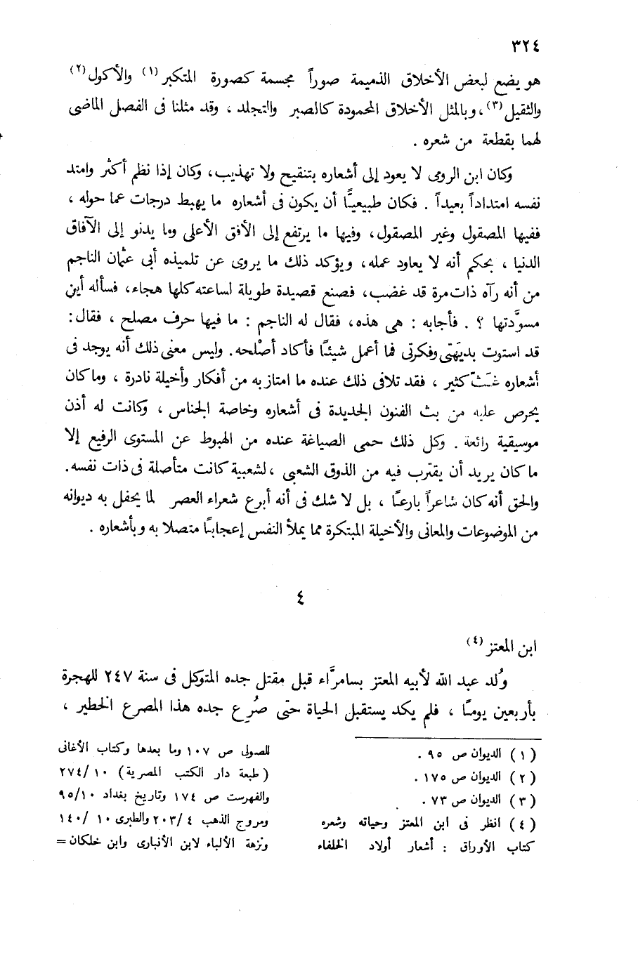 (¬4) انظر فى ابن المعتز وحياته وشعره كتاب الأوراق: أشعار أولاد الخلفاء للصولى ص 107 وما بعدها وكتاب الأغانى (طبعة دار الكتب المصرية) 10/ 274 والفهرست ص 174 وتاريخ بغداد 10/ 95 ومروج الذهب 4/ 203 والطبرى 10/ 140 ونزهة الألباء لابن الأنبارى وابن خلكان-