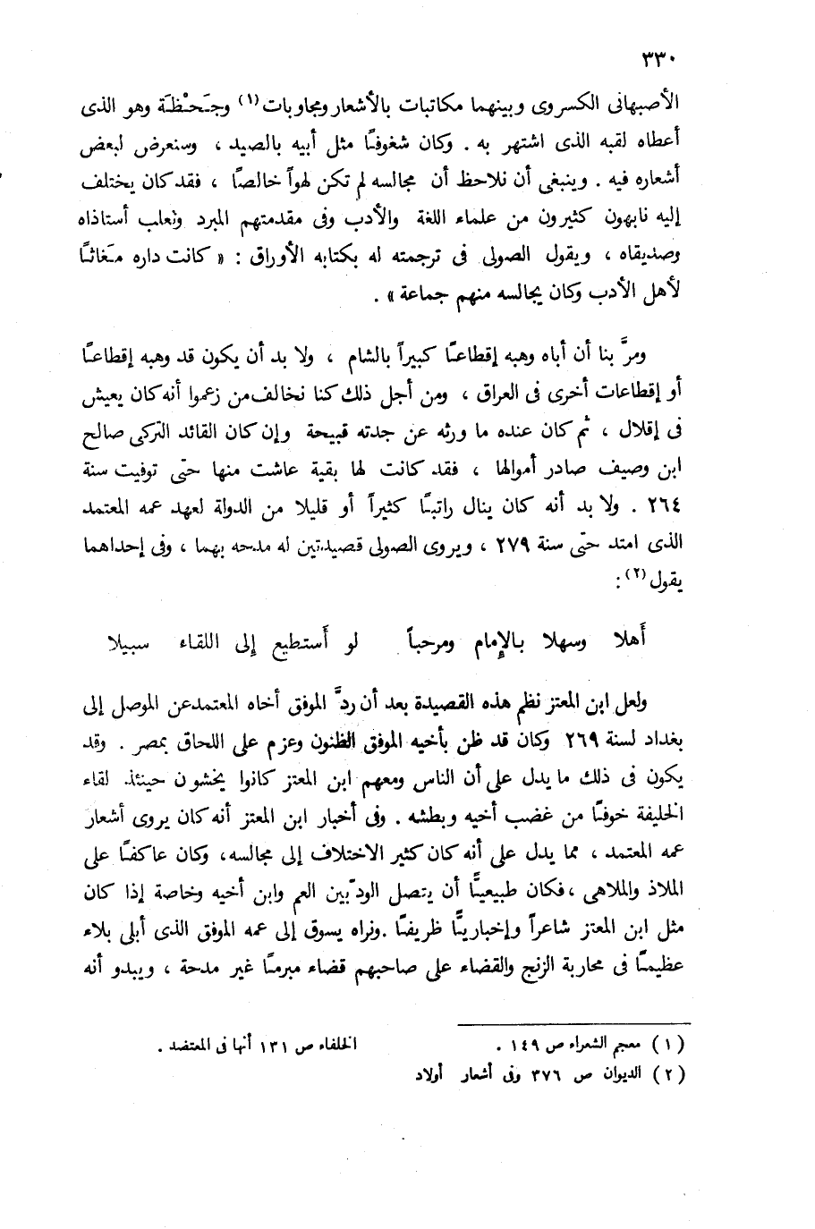 ومرّ بنا أن أباه وهبه إقطاعا كبيرا بالشام، ولا بد أن يكون قد وهبه إقطاعا أو إقطاعات أخرى فى العراق، ومن أجل ذلك كنا نخالف من زعموا أنه كان يعيش فى إقلال، ثم كان عنده ما ورثه عن جدته قبيحة وإن كان القائد التركى صالح ابن وصيف صادر أموالها، فقد كانت لها بقية عاشت منها حتى توفيت سنة 264. ولا بد أنه كان ينال راتبا كثيرا أو قليلا من الدولة لعهد عمه المعتمد الذى امتد حتى سنة 279، ويروى الصولى قصيدتين له مدحه بهما، وفى إحداهما يقول (¬2):