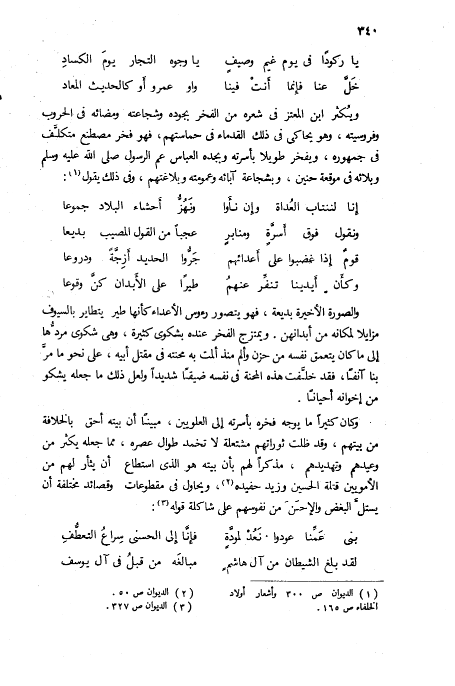 وكان كثيرا ما يوجه فخره بأسرته إلى العلويين، مبينا أن بيته أحق بالخلافة من بيتهم، وقد ظلت ثوراتهم مشتعلة لا تخمد طوال عصره، مما جعله يكثر من وعيدهم وتهديدهم، مذكرا لهم بأن بيته هو الذى استطاع أن يثأر لهم من الأمويين قتلة الحسين وزيد حفيده (¬2)، ويحاول فى مقطوعات وقصائد مختلفة أن يستلّ البغض والإحن من نفوسهم على شاكلة قوله (¬3):