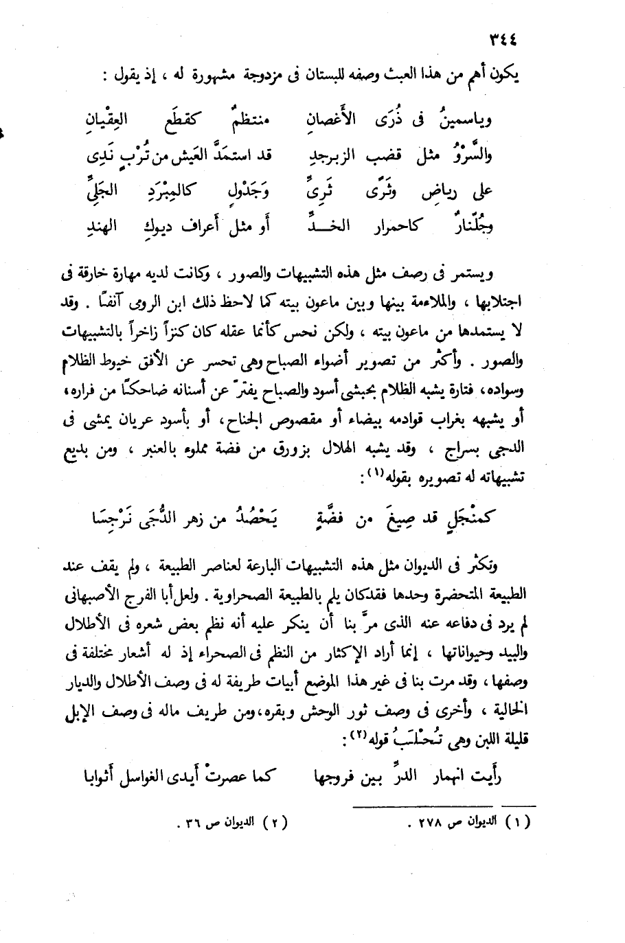 وتكثر فى الديوان مثل هذه التشبيهات البارعة لعناصر الطبيعة، ولم يقف عند الطبيعة المتحضرة وحدها فقد كان يلم بالطبيعة الصحراوية. ولعل أبا الفرج الأصبهانى لم يرد فى دفاعه عنه الذى مرّ بنا أن ينكر عليه أنه نظم بعض شعره فى الأطلال والبيد وحيواناتها، إنما أراد الإكثار من النظم فى الصحراء إذ له أشعار مختلفة فى وصفها، وقد مرت بنا فى غير هذا الموضع أبيات طريفة له فى وصف الأطلال والديار الخالية، وأخرى فى وصف ثور الوحش وبقره، ومن طريف ماله فى وصف الإبل قليلة اللبن وهى تحلب قوله (¬2):