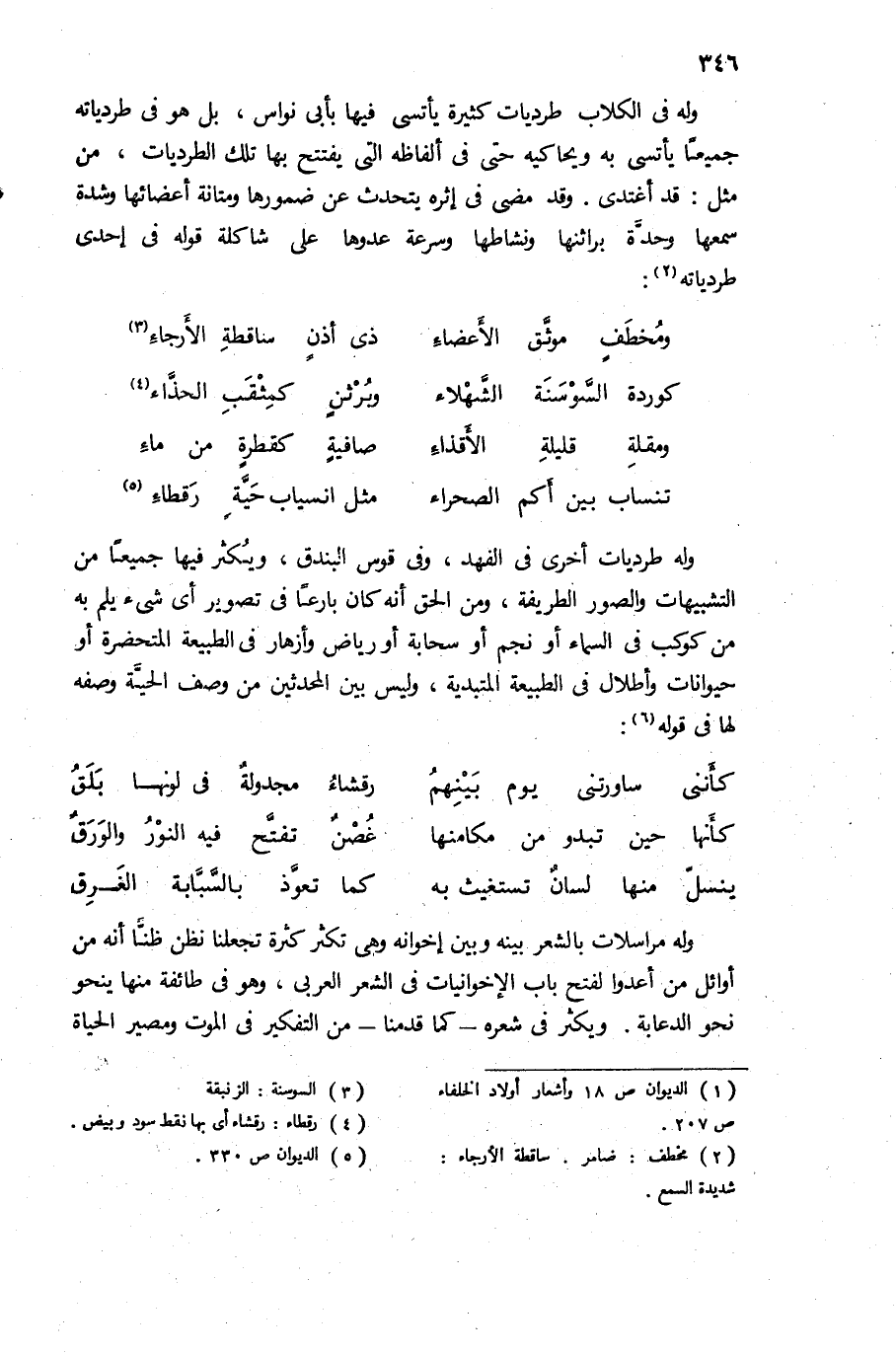 وله طرديات أخرى فى الفهد، وفى قوس البندق، ويكثر فيها جميعا من التشبيهات والصور الطريفة، ومن الحق أنه كان بارعا فى تصوير أى شئ يلم به من كوكب فى السماء أو نجم أو سحابة أو رياض وأزهار فى الطبيعة المتحضرة أو حيوانات وأطلال فى الطبيعة المتبدية، وليس بين المحدثين من وصف الحيّة وصفه لها فى قوله (¬5):