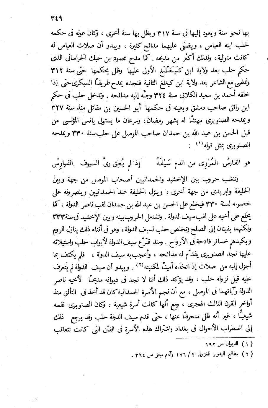 وتنشب حروب بين الإخشيد والحمدانيين أصحاب الموصل من جهة وبين الخليفة والبريدى من جهة أخرى، وينزل الخليفة عند الحمدانيين وينصرونه على خصومه لسنة 330 فيخلع على الحسن بن عبد الله بن حمدان لقب ناصر الدولة، كما يخلع على أخيه على لقب سيف الدولة. وتشتعل الحروب بينه وبين الإخشيد فى سنة 333 ولكنهما يفيئان إلى الصلح وتخلص حلب لسيف الدولة، وهو فى أثناء ذلك ينازل الروم ويكبدهم خسائر فادحة فى الأرواح. ومنذ قرع سيف الدولة لأبواب حلب واستيلائه عليها نجد الصنوبرى يقدّم له مدائحه، وأعجب به سيف الدولة، فلم يكتف بما أجزل إليه من صلات إذ اتخذه أمينا لمكتبته (¬2). ويبدو أن سيف الدولة لم يتعرف عليه قبل نزوله حلب، وقد يؤكد ذلك أننا لا نجد فى ديوانه مديحا لأخيه ناصر الدولة وآبائهما فى الموصل، مع أن نجم الأسرة الحمدانية كان قد أخذ فى التألق منذ أواخر القرن الثالث الهجرى، ومع أنها كانت أسرة شيعية، وكان الصنوبرى نفسه شيعيّا، غير أنه ظل منحرفا عنها، حتى قدم سيف الدولة حلب وقد يرجع ذلك إلى اضطراب الأحوال فى بغداد واشتراك هذه الأسرة فى الفتن التى كانت تتعاقب