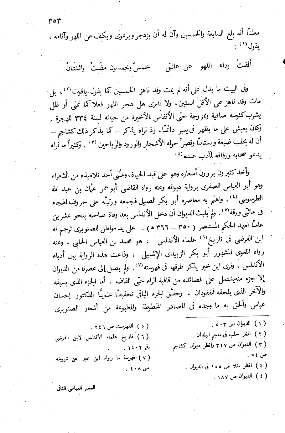 وأخذ كثيرون يروون أشعاره وهو على قيد الحياة، وعنى أحد تلاميذه من الشعراء وهو أبو العباس الصفرى برواية ديوانه وعنه رواه القاضى أبو عمر عثمان بن عبد الله الطرسوسى (¬5)، واهتم به معاصره أبو بكر الصولى فجمعه ورتبّه على حروف الهجاء فى مائتى ورقة (¬6). ولم يلبث الديوان أن دخل الأندلس بعد وفاة صاحبه بنحو عشرين عاما لعهد الحكم المستنصر (350 - 366 هـ). على يد مواطن للصنوبرى ترجم له ابن الفرضى فى تاريخ (¬7) علماء الأندلس، هو محمد بن العباس الحلبى، وعنه رواه اللغوى المشهور أبو بكر الزبيدى الإشبيلى، وذاعت هذه الرواية بين أدباء الأندلس، ونرى ابن خير يذكر طرقها فى فهرسته (¬8). ولم يصل إلى عصرنا من الديوان إلا جزء منه يشتمل على قصائده من قافية الراء حتى القاف، أما الجزء الذى يسبقه والآخر الذى يلحقه فمفقودان، وحقّق الجزء الباقى تحقيقا علميّا الدكتور إحسان عباس وألحق به ما وجده فى المصادر المخطوطة والمطبوعة من أشعار الصنوبرى