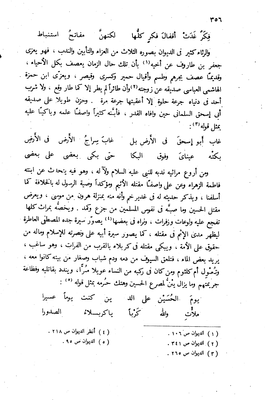 ومن أروع مراثيه ندبه للنبى عليه السلام ولآله، وهو فيه يتحدث عن ابنته فاطمة الزهراء وعن على واصفا مقتله الأثيم ومؤكدا وصية الرسول له بالخلافة كما أسلفنا، ويذكر حديثه له فى غدير خم وأنه منه بمنزلة هرون من موسى، ويعرض مقتل الحسين وما صبّه فى نفوس المسلمين من جزع وكمد. ويخصّه بمراث كلها تفجع عليه ولوعات وزفرات، ونراه فى بعضها (¬4) يصوّر سيرة جده المصطفى العاطرة ليظهر مدى الإثم فى مقتله، كما يصور سيرة أبيه على ونصرته للإسلام وماله من حقوق على الأمة، ويبكى مقتله فى كربلاء بالقرب من الفرات، وهو ساغب، يريد بعض الماء، فتلعق السيوف من دمه ودم شباب وصغار من بيته كانوا معه، وتعول أم كلثوم ومن كان فى ركبه من النساء عويلا مرّا، ويندد بقاتليه وفظاعة جريمتهم وما يزال يئنّ لمصرع الحسين وهتك حرمه بمثل قوله (¬5):