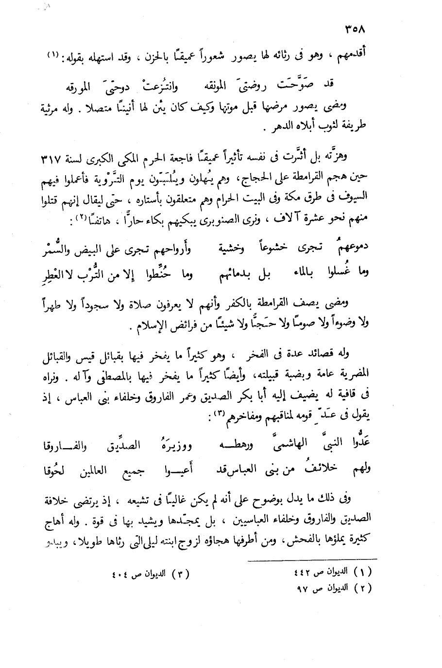 وفى ذلك ما يدل بوضوح على أنه لم يكن غاليا فى تشيعه، إذ يرتضى خلافة الصديق والفاروق وخلفاء العباسيين، بل يمجّدها ويشيد بها فى قوة. وله أهاج كثيرة يملؤها بالفحش، ومن أطرفها هجاؤه لزوج ابنته ليلى التى رثاها طويلا، و؟ ؟ ؟