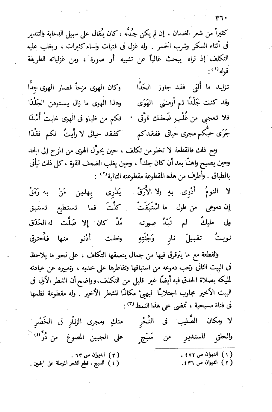 والقطعة مع ما يترقرق فيها من جمال يتعمقها التكلف، على نحو ما يلاحظ فى البيت الثانى وتعب دموعه من استباقها وتقاطرها على خديه، وتعبيره عن عبادته لمليكه بصلاة الحدق فيه أيضا غير قليل من التكلف، وواضح أن الشطر الأول فى البيت الأخير مجلوب اجتلابا ليهيئ مكانا للشطر الأخير. وله مقطوعة نظمها فى فتاة مسيحية، تمضى على هذا النمط (¬3):