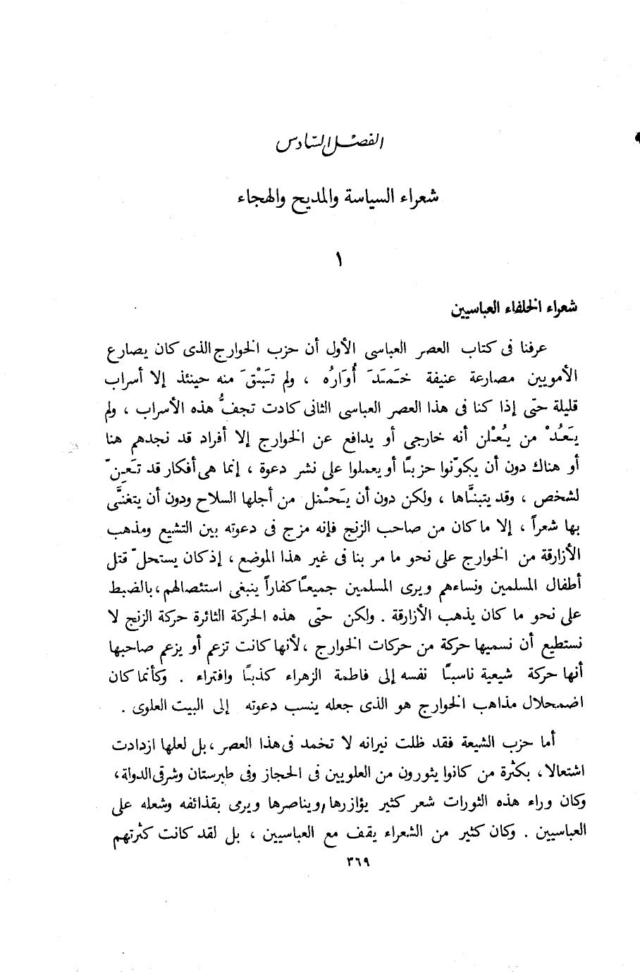 عرفنا فى كتاب العصر العباسى الأول أن حزب الخوارج الذى كان يصارع الأمويين مصارعة عنيفة خمد أواره، ولم تسبق منه حينئذ إلا أسراب قليلة حتى إذا كنا فى هذا العصر العباسى الثانى كادت تجفّ هذه الأسراب، ولم يعد من يعلن أنه خارجى أو يدافع عن الخوارج إلا أفراد قد نجدهم هنا أو هناك دون أن يكوّنوا حزبا أو يعملوا على نشر دعوة، إنما هى أفكار قد تعنّ لشخص، وقد يتبنّاها، ولكن دون أن يحمل من أجلها السلاح ودون أن يتغنّى بها شعرا، إلا ما كان من صاحب الزنج فإنه مزج فى دعوته بين التشيع ومذهب الأزارقة من الخوارج على نحو ما مر بنا فى غير هذا الموضع، إذ كان يستحلّ قتل أطفال المسلمين ونساءهم ويرى المسلمين جميعا كفارا ينبغى استفصالهم، بالضبط على نحو ما كان يذهب الأزارقة. ولكن حتى هذه الحركة الثائرة حركة الزنج لا تستطيع أن نسميها حركة من حركات الخوارج، لأنها كانت تزعم أو يزعم صاحبها أنها حركة شيعية ناسبا نفسه إلى فاطمة الزهراء كذبا وافتراء. وكأنما كان اضمحلال مذاهب الخوارج هو الذى جعله ينسب دعوته إلى البيت العلوى.