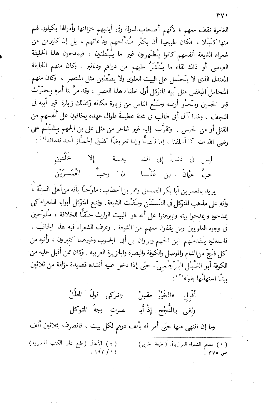 الغامرة تقف معهم؛ لأنهم أصحاب الدولة وفى أيديهم خزائنها وأموالها يكيلون لهم منها كيلا، فكان طبيعيا أن يكثر مدّاحهم ودعاتهم، بل إن كثيرين من شعراء الشيعة أنفسهم كانوا يظهرون غير ما يبطنون، فيمدحون هذا الخليفة العباسى أو ذاك لقاء ما ينشر عليهم من دراهم ودنانير. وكان منهم الخليفة المعتدل الذى لا يحمل على البيت العلوى ولا يضطغن مثل المنتصر، وكان منهم المتحامل المبغض مثل أبيه المتوكل أول خلفاء هذا العصر، وقد مرّ بنا أمره بحرث قبر الحسين ومحو أرضه ومنع الناس من زيارة مكانه وكذلك زيارة قبر أبيه فى النجف، وغدا آل أبى طالب فى محنة عظيمة طوال عهده يخافون على أنفسهم من القتل أو من المجلس. وتقرّب إليه غير شاعر من مثل على بن الجهم بشتم على رضى الله عنه كما أسلفنا، إما نصّا وإما تعريضا كقول الجمّاز أحد ندمائه (¬1):
