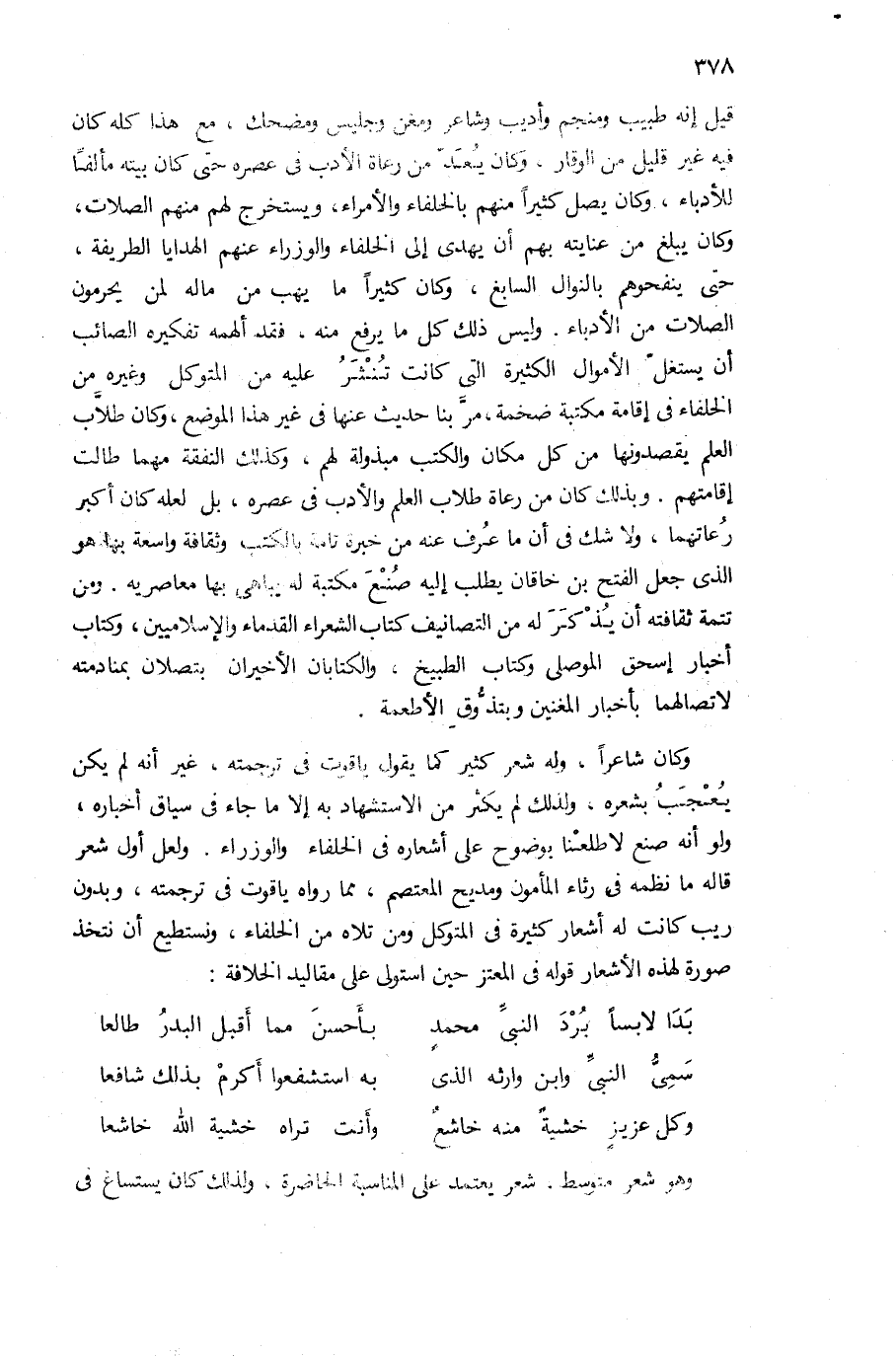 قيل إنه طبيب ومنجم وأديب وشاعر ومغن وجليس ومضحك. مع هذا كله كان فيه غير قليل من الوقار، وكان يعدّ من رعاة الأدب فى عصره حتى كان بيته مألفا للأدباء، وكان يصل كثيرا منهم بالخلفاء والأمراء، ويستخرج لهم منهم الصلات، وكان يبلغ من عنايته بهم أن يهدى إلى الخلفاء والوزراء عنهم الهدايا الطريفة، حتى ينفحوهم بالنوال السابغ، وكان كثيرا ما يهب من ماله لمن يحرمون الصلات من الأدباء. وليس ذلك كل ما يرفع منه، فقد ألهمه تفكيره الصائب أن يستغلّ الأموال الكثيرة التى كانت تنشر عليه من المتوكل وغيره من الخلفاء فى إقامة مكتبة ضخمة، مرّ بنا حديث عنها فى غير هذا الموضع، وكان طلاّب العلم يقصدونها من كل مكان والكتب مبذولة لهم، وكذلك النفقة مهما طالت إقامتهم. وبذلك كان من رعاة طلاب العلم والأدب فى عصره، بل لعله كان أكبر رعاتهما، ولا شك فى أن ما عرف عنه من خبرة تامة بالكتب وثقافة واسعة بها هو الذى جعل الفتح بن خاقان يطلب إليه صنع مكتبة له يباهى بها معاصريه. ومن تتمة ثقافته أن يذكر له من التصانيف كتاب الشعراء القدماء والإسلاميين، وكتاب أخبار إسحق الموصلى وكتاب الطبيخ، والكتابان الأخيران بتصلان بمنادمته لاتصالهما بأخبار المغنين وبتذوّق الأطعمة.
