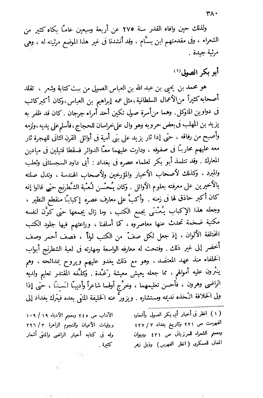 (¬1) انظر فى أخبار أبى بكر الصولى وأشعاره الفهرست ص 221 وتاريخ بغداد 3/ 427 ومعجم الشعراء للمرزبانى ص 431 وديوان المعانى للعسكرى (انظر الفهرس وذيل زهر الآداب ص 245 ومعجم الأدباء 19/ 109 ووفيات الأعيان والنجوم الزاهرة 3/ 296 وله فى كتابه أخبار الراضى والمتقى أشعار كثيرة.