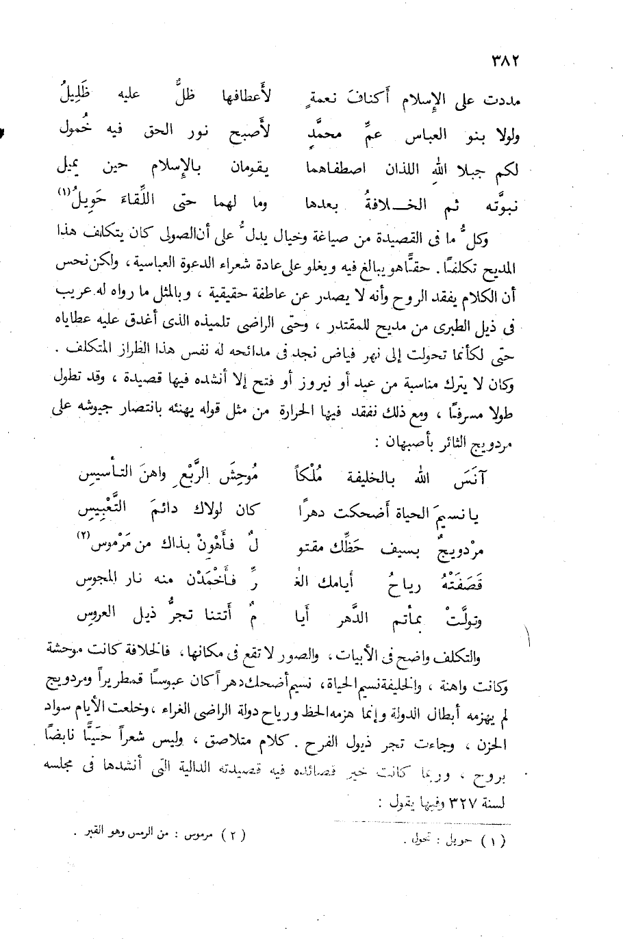 والتكلف واضح فى الأبيات، والصور لا تقع فى مكانها، فالخلافة كانت موحشة وكانت واهنة، والخليفة نسيم الحياة، نسيم أضحك دهرا كان عبوسا قمطريرا ومردويج لم يهزمه أبطال الدولة وإنما هزمه الحظ ورياح دولة الراضى الغراء، وخلعت الأيام سواد الحزن، وجاءت تجر ذيول الفرح. كلام متلاصق، وليس شعرا حيّا نابضا بروح، وربما كانت خير قصائده فيه قصيدته الدالية التى أنشدها فى مجلسه لسنة 327 وفيها يقول: