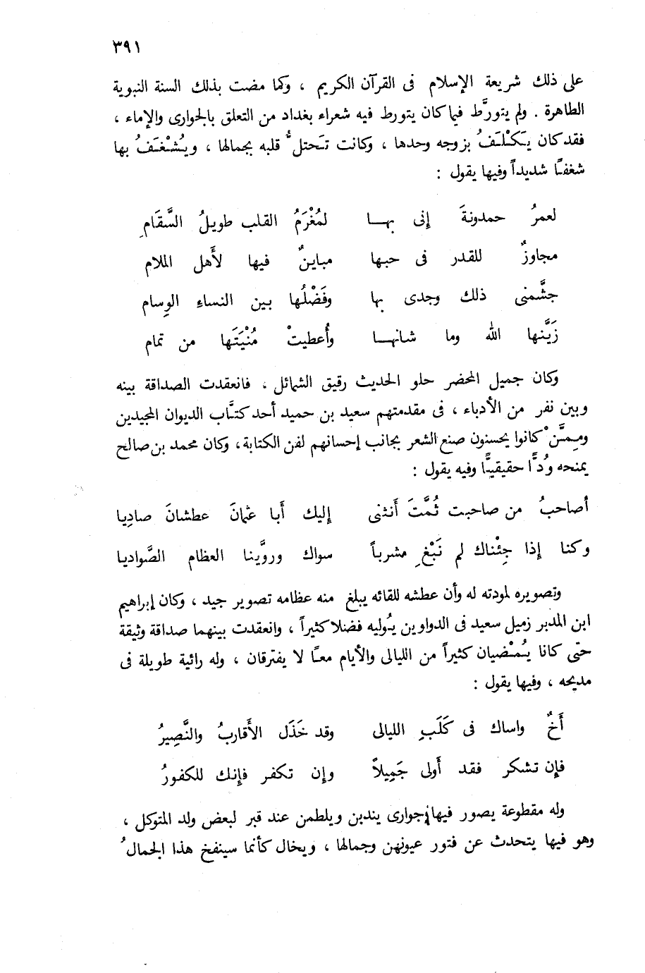 على ذلك شريعة الإسلام فى القران الكريم، وكما مضت بذلك السنة النبوية الطاهرة. و؟ ؟ ؟ ؟ ؟ ؟ فيما كان يتورط فيه شعراء بغداد من التعلق بالجوارى والإماء، فقد كان يكلّف بزوجه وحدها، وكانت تحتلّ قلبه بجمالها، ويشغف بها شغفا شديدا وفيها يقول: