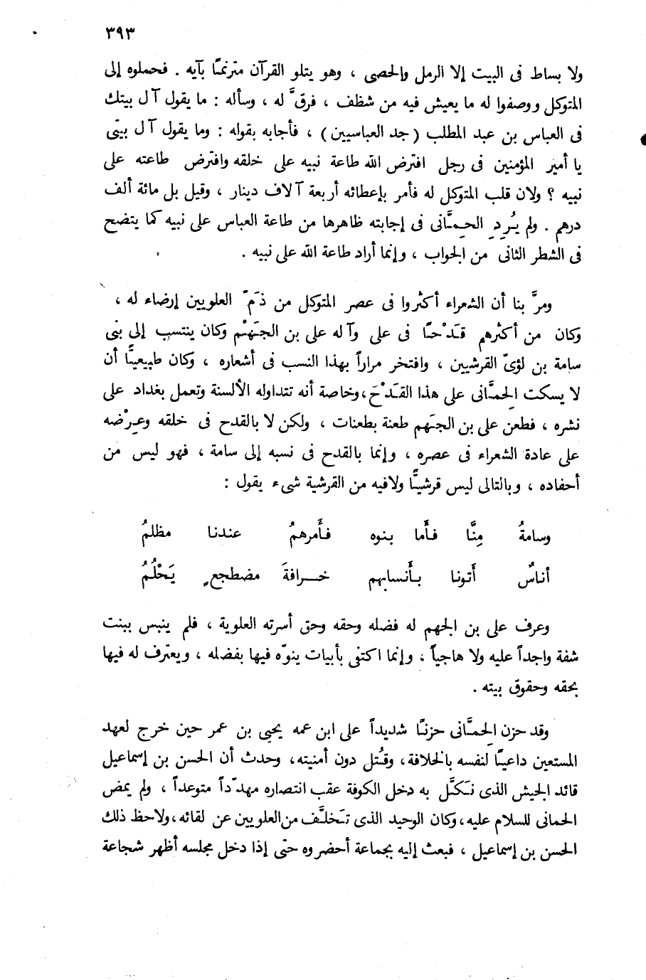 ومرّ بنا أن الشعراء أكثروا فى عصر المتوكل من ذمّ العلويين إرضاء له، وكان من أكثرهم قدحا فى على وآله على بن الجهم وكان ينتسب إلى بنى سامة بن لؤىّ القرشيين، وافتخر مرارا بهذا النسب فى أشعاره، وكان طبيعيّا أن لا يسكت الحمّانى على هذا القدح، وخاصة أنه تتداوله الألسنة وتعمل بغداد على نشره، فطعن على بن الجهم طعنة بطعنات، ولكن لا بالقدح فى خلقه وعرضه على عادة الشعراء فى عصره، وإنما بالقدح فى نسبه إلى سامة، فهو ليس من أحفاده، وبالتالى ليس قرشيّا ولا فيه من القرشية شئ يقول: