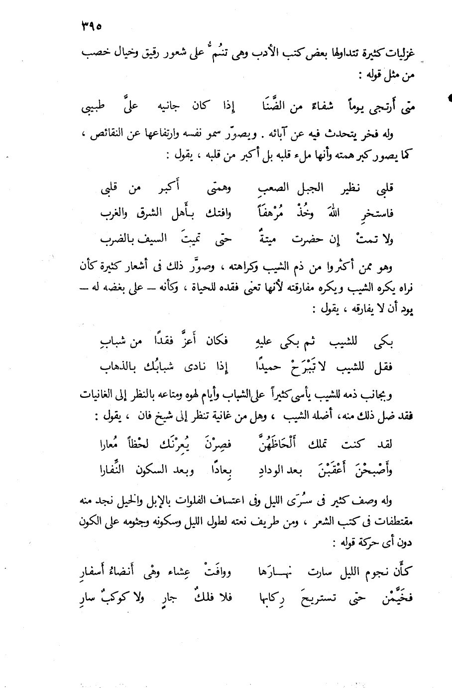 وبجانب ذمه للشيب يأسى كثيرا على الشباب وأيام لهوه ومتاعه بالنظر إلى الغانيات فقد ضل ذلك منه، أضله الشيب، وهل من غانية تنظر إلى شيخ فان، يقول: