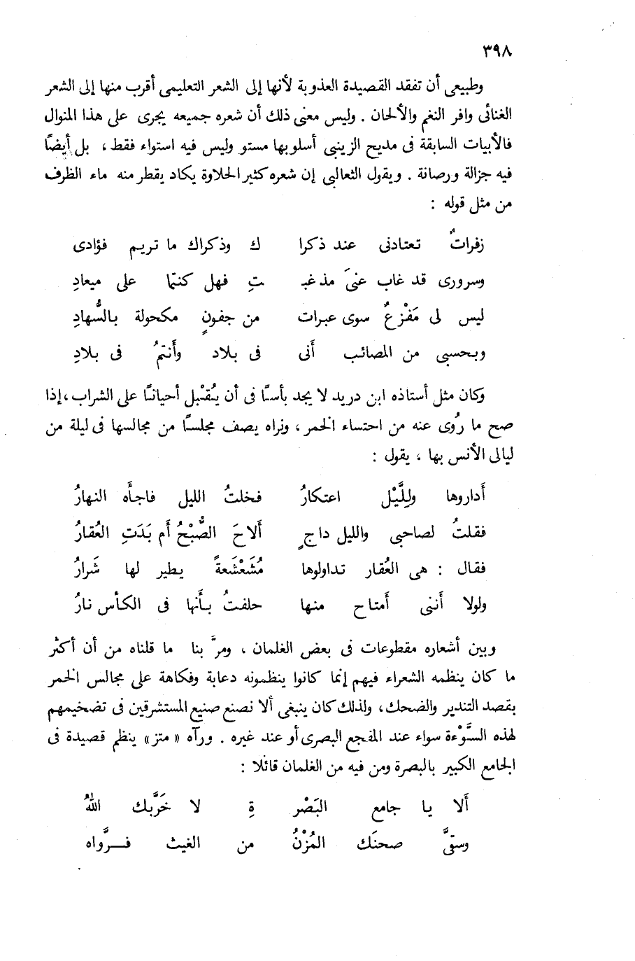 وطبيعى أن تفقد القصيدة العذوبة لأنها إلى الشعر التعليمى أقرب منها إلى الشعر الغنائى وافر النغم والألحان. وليس معنى ذلك أن شعره جميعه يجرى على هذا المنوال فالأبيات السابقة فى مديح الزينبى أسلوبها مستو وليس فيه استواء فقط، بل أيضا فيه جزالة ورصانة. ويقول الثعالبى إن شعره كثير الحلاوة يكاد يقطر منه ماء الظرف من مثل قوله: