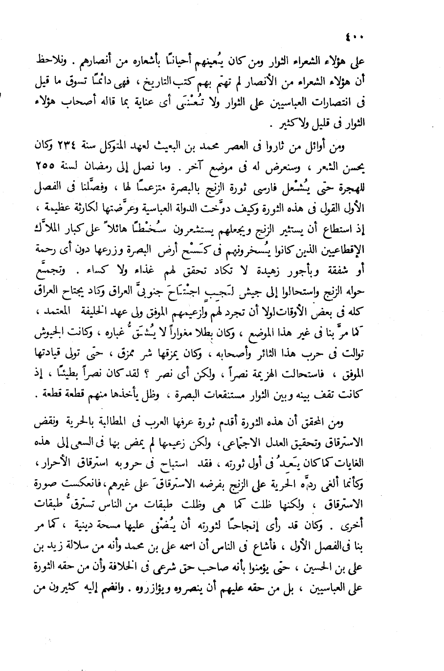 ومن أوائل من ثاروا فى العصر محمد بن البعيث لعهد المتوكل سنة 234 وكان يحسن الشعر، وسنعرض له فى موضع آخر. وما نصل إلى رمضان لسنة 255 للهجرة حتى يشعل فارسى ثورة الزنج بالبصرة متزعما لها، وفصّلنا فى الفصل الأول القول فى هذه الثورة وكيف دوّخت الدولة العباسية وعرّضتها لكارثة عظيمة، إذ استطاع أن يستثير الزنج ويجعلهم يستشعرون سخطا هائلا على كبار الملاّك الإقطاعيين الذين كانوا يسخرونهم فى كسح أرض البصرة وزرعها دون أى رحمة أو شفقة وبأجور زهيدة لا تكاد تحقق لهم غذاء ولا كساء. وتجمّع حوله الزنج واستحالوا إلى جيش لجب اجتاح جنوبىّ العراق وكاد يجتاح العراق كله فى بعض الأوقات لولا أن تجرد لهم ولزعيمهم الموفق ولى عهد الخليفة المعتمد، كما مرّ بنا فى غير هذا الموضع، وكان بطلا مغوارا لا يشقّ غباره، وكانت الجيوش توالت فى حرب هذا الثائر وأصحابه، وكان يمزقها شر ممزق، حتى تولى قيادتها الموفق، فاستحالت الهزيمة نصرا، ولكن أى نصر؟ لقد كان نصرا بطيئا، إذ كانت تقف بينه وبين الثوار مستنقعات البصرة، وظل يأخذها منهم قطعة قطعة.